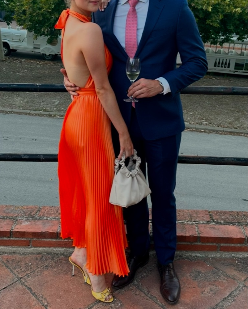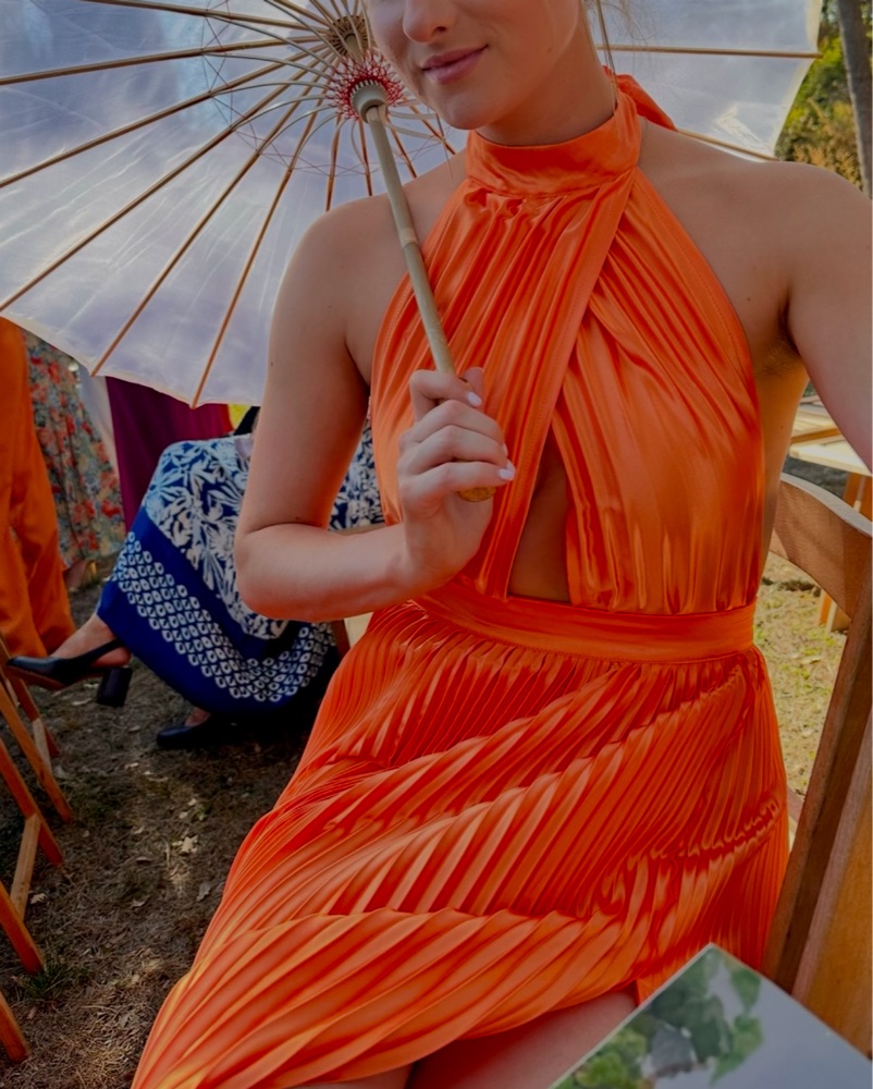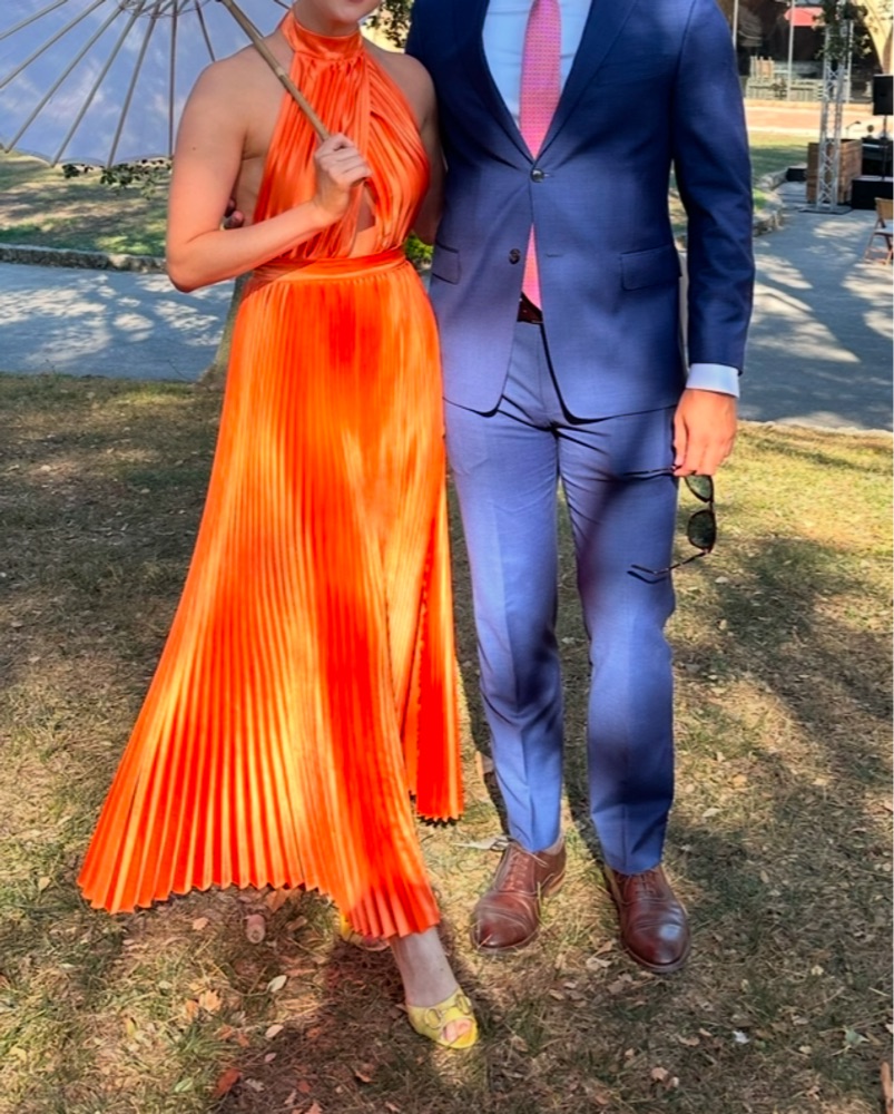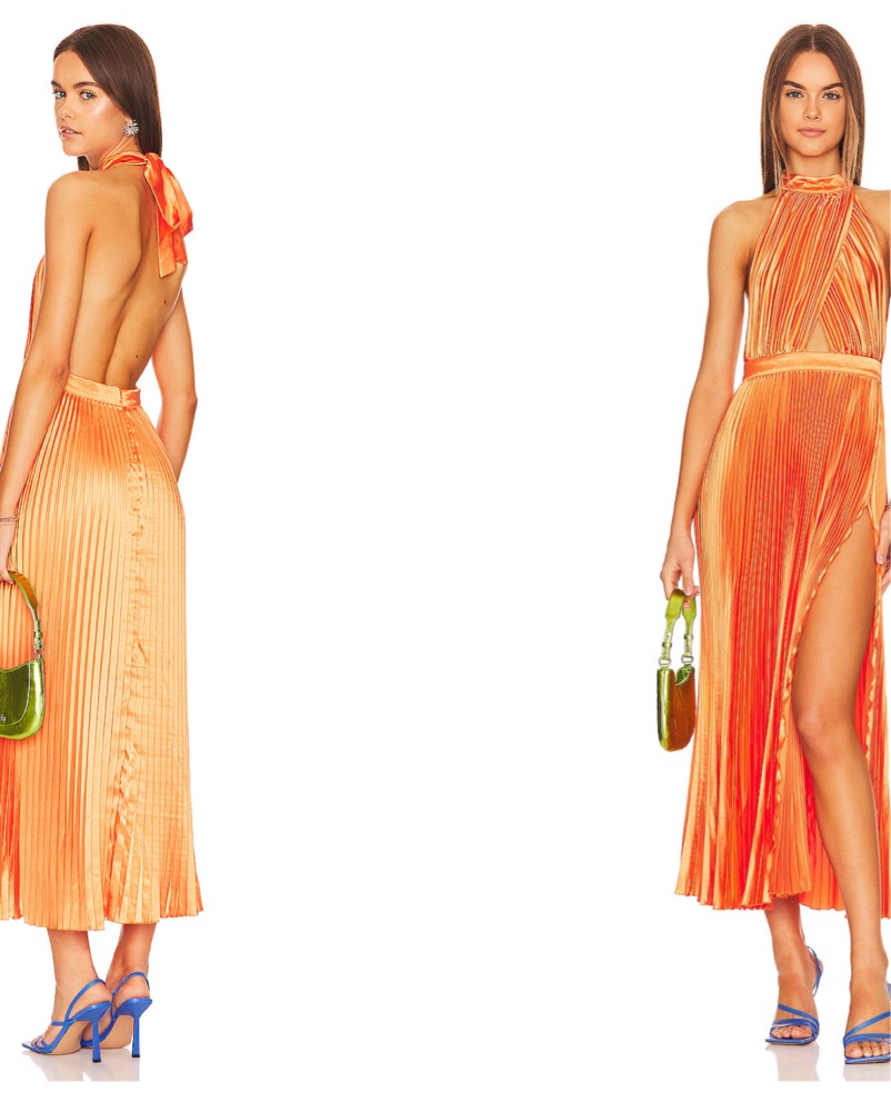 AU 6, EU: 34 Color: Tangelo This stunning pleated halter gown in a vibrant orange hue is perfect for a formal event or special occasion. The elegant draping and high-neck silhouette create a sophisticated look.