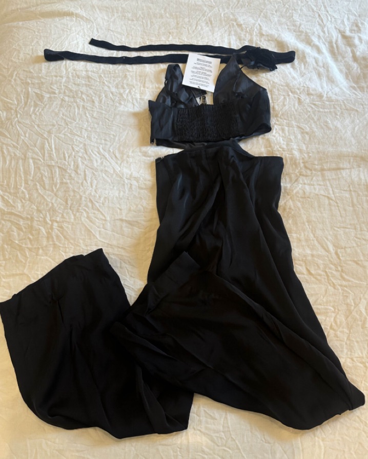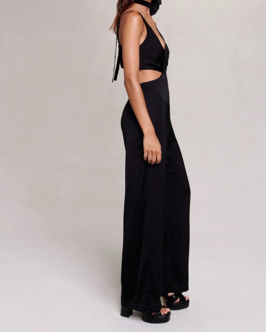 This trouser suit embodies a chic and relaxed look. Featuring thin adjustable straps and a zipped fastening on the trousers, it has a cutaway waist, for a subtle glimpse of skin. Satin on the outside and matte on the inside, it has a plunging neckline. European size 34.