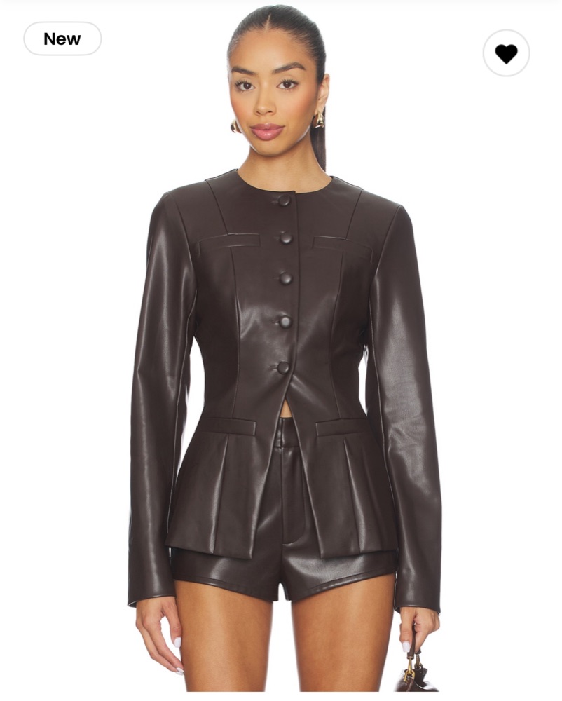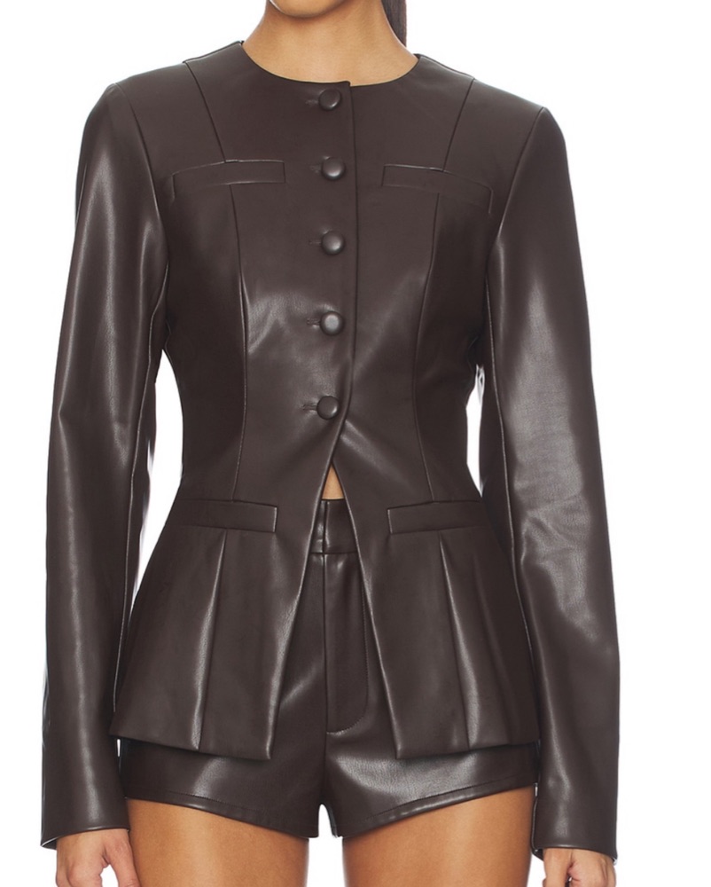 This chic faux leather blazer is perfect for creating a stylish, edgy look. Pair it with shorts or a mini skirt for a night out. SMALL TOP / MEDIUM BOTTOM. Can be rented together or separately.
