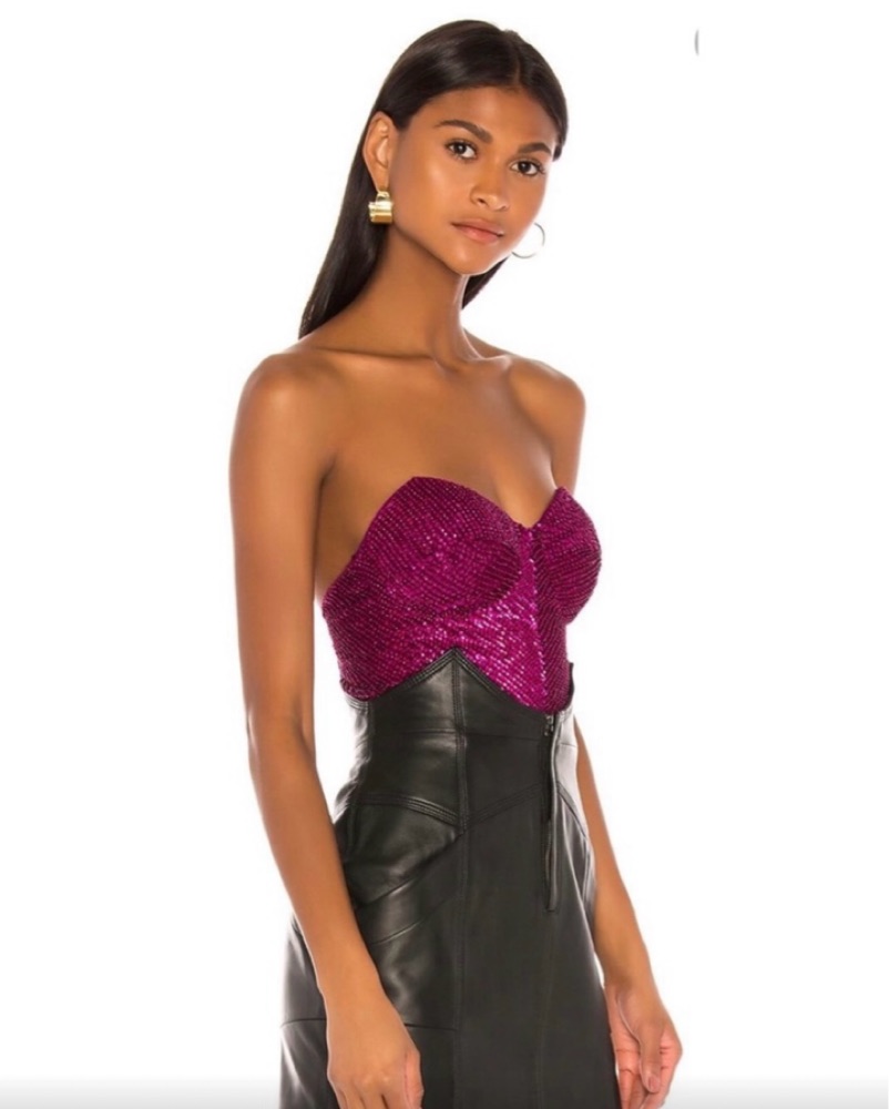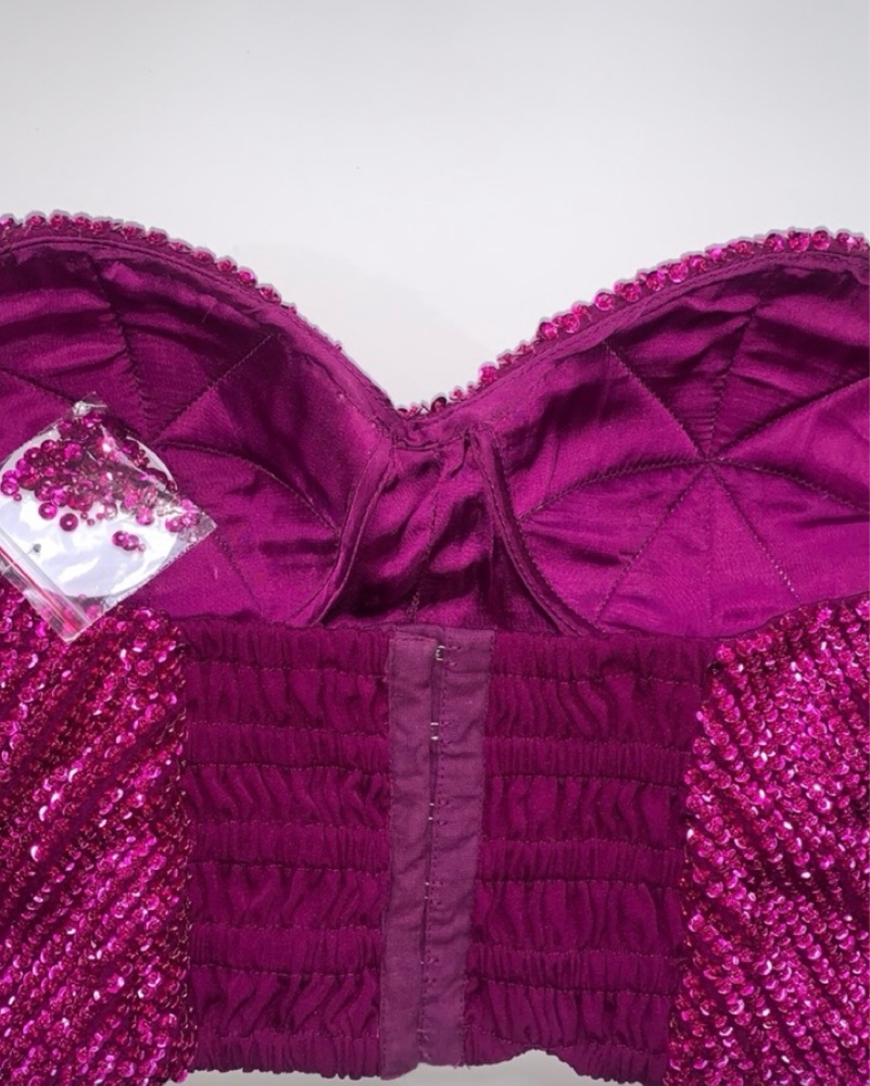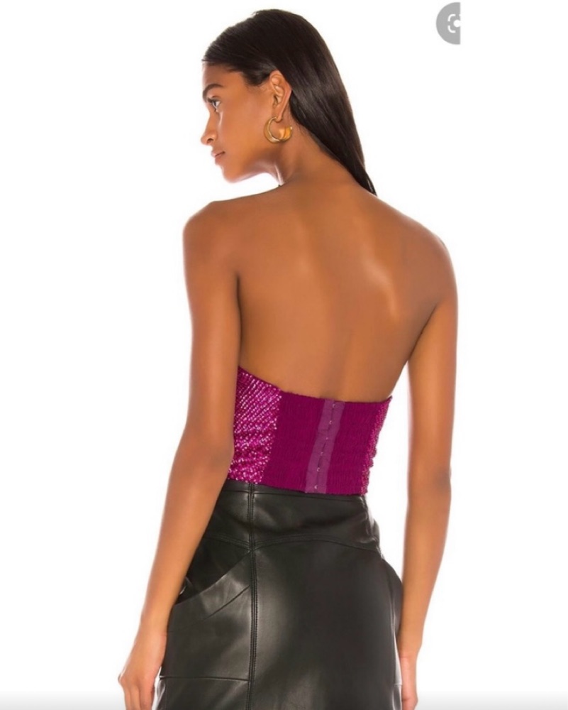 New with tags, has a structured fit, sweetheart neckline, and smocked back. Best for A–C cups, as it runs snug in the bust. Very delicate as it is beaded. Please no self tanner.