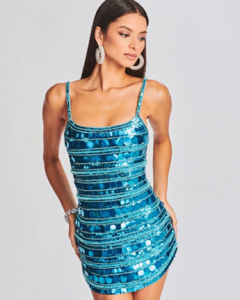 This dazzling sequin mini dress is perfect for girls night out, birthday or bachelorette. The blue sequins are perfect for a fun night!