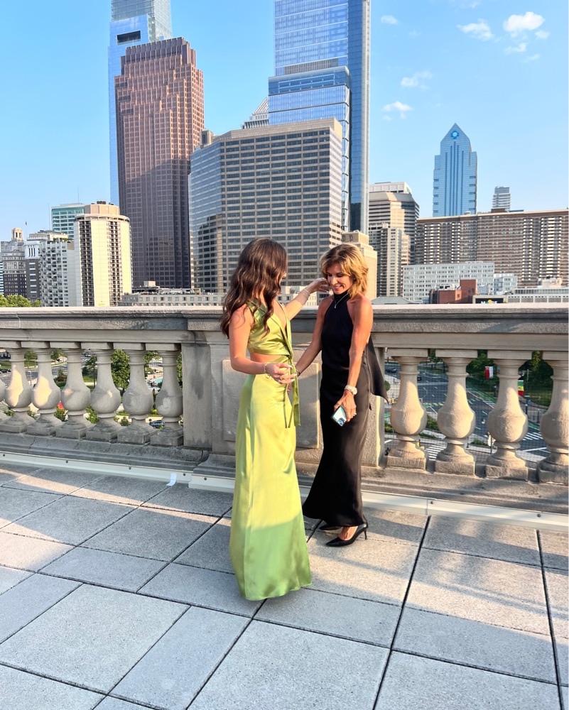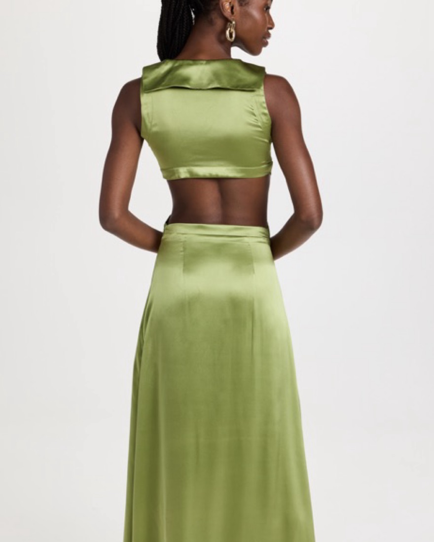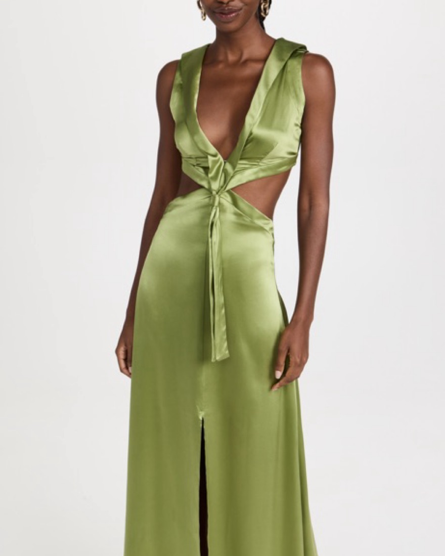 A classic cut out maxi dress with a sailor collar back flap and deep v- neck tie in silk