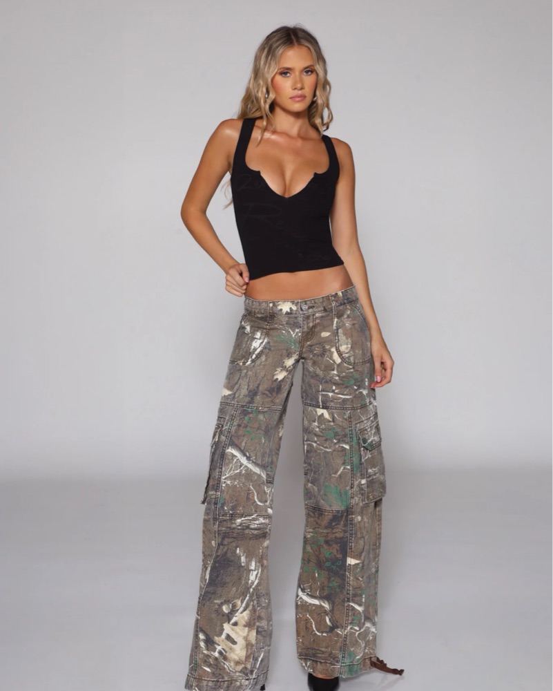 Camo cargo pants with draw string bottoms to adjust length - runs a bit smaller I’d say 25-26 would fit