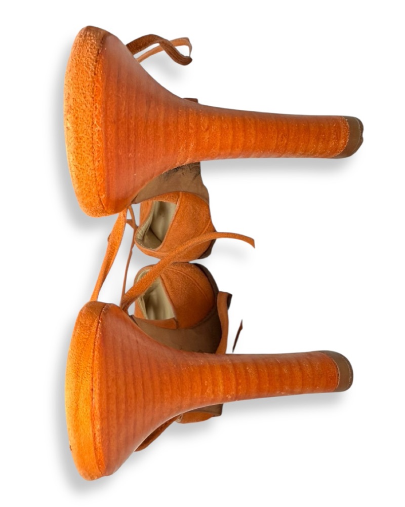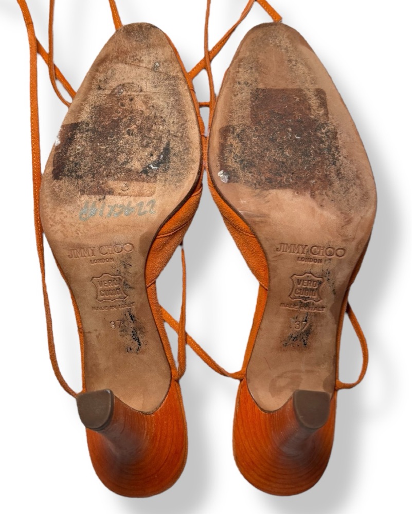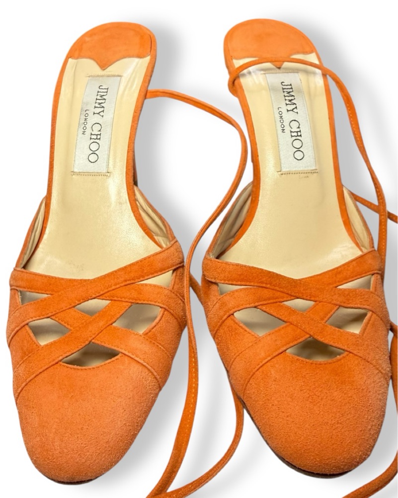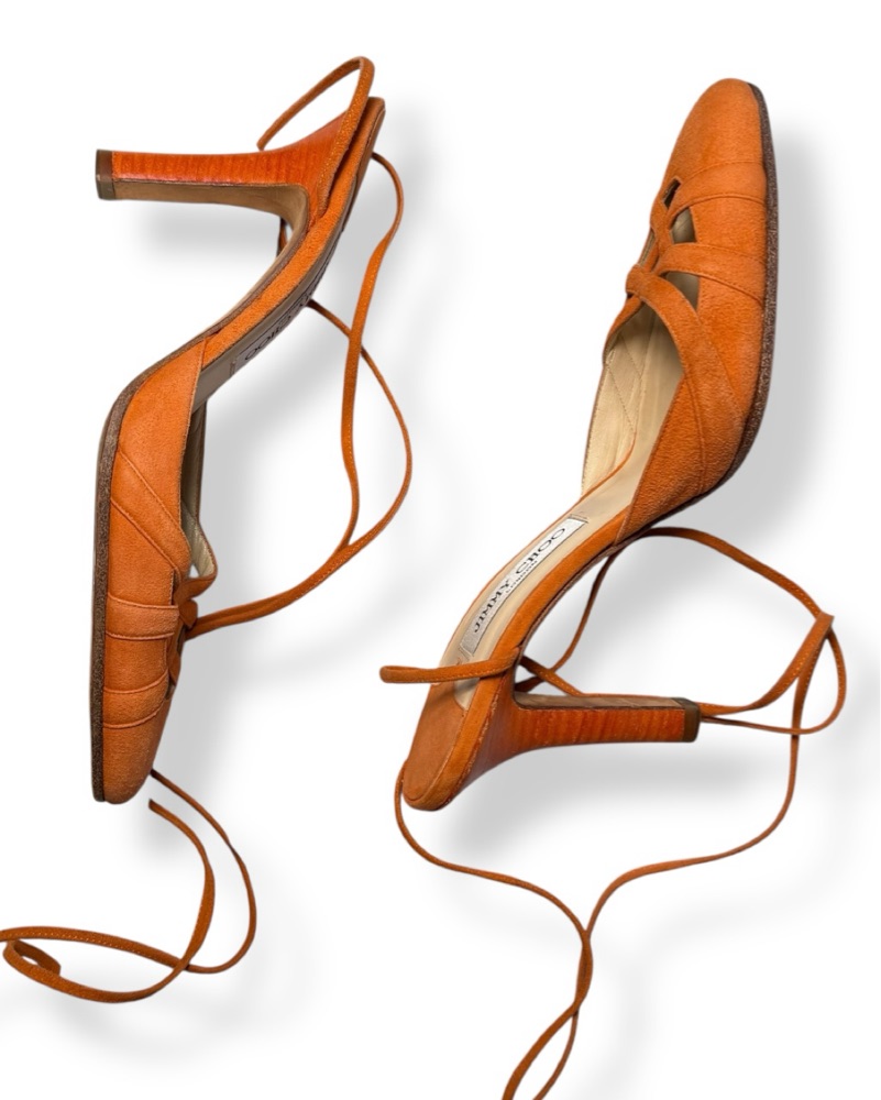 Sz 37 vintage rust orange suede Jimmy Choo lace up mules with a 4” stacked heel. In very good condition with minor scuffing on the right toe box and wear on each counter. Notable wear on soles. Best for a 6/6.5