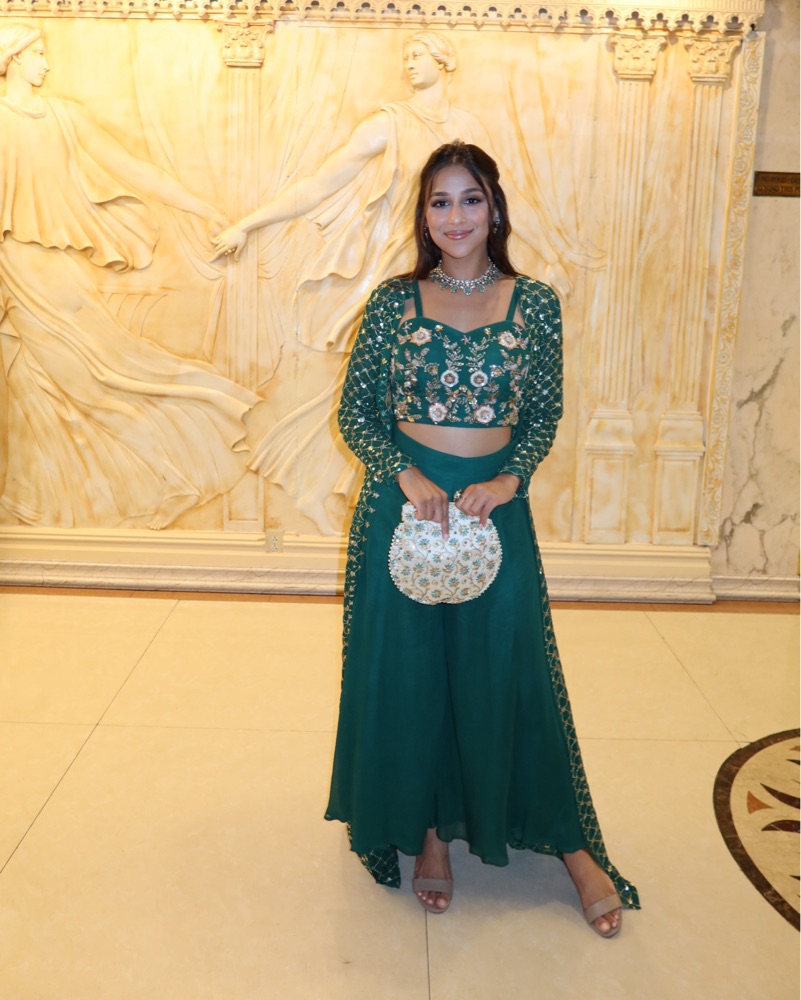 This stunning green ensemble is perfect for a glamorous evening event. The intricate embroidered details and shimmering accents create an opulent, eye-catching look. Perfect for almost any occasion! I’m usually a size 4, but this outfit definitely had room to play!