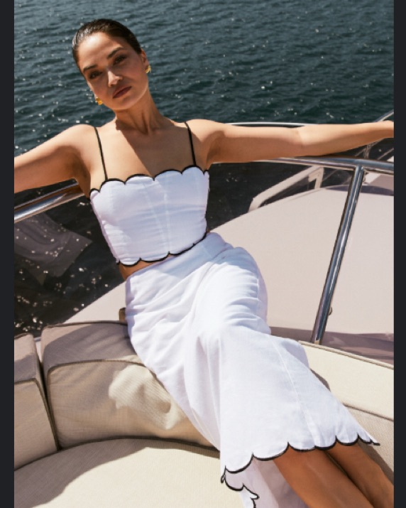 This chic scalloped white crop top is perfect for a stylish day out or a night on the town. Pair it with high-waisted trousers or the matching skirt for a sophisticated look.
