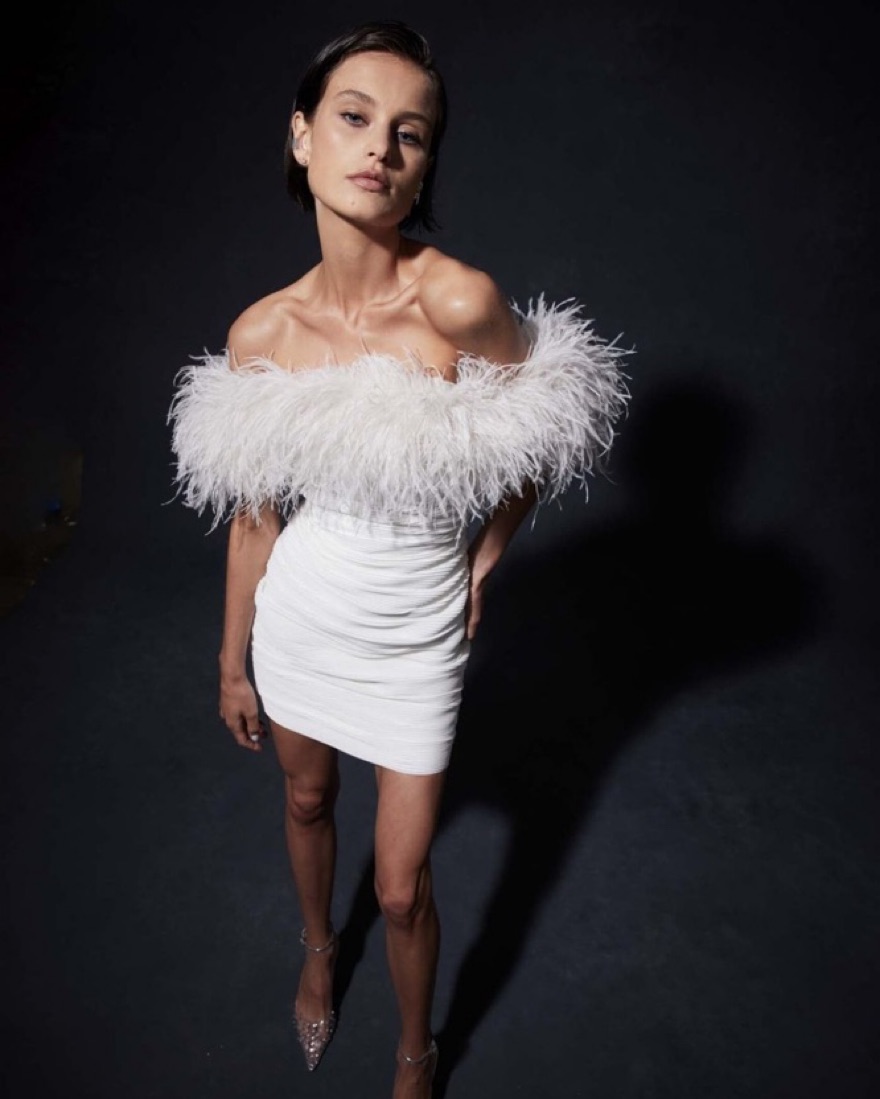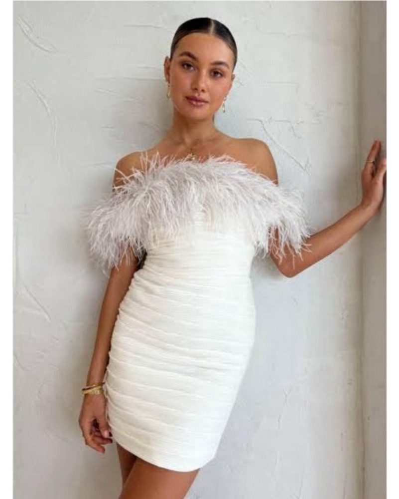 Size: AU 1/US 4. Fits true to size. The most insanely beautiful white mini dress! Brand new. Size Tags: bridal mini dress, feather dress, reception dress, cult gaia, sequins, feather, manning cartell, bride, feathers, vegas, cocktail, wedding