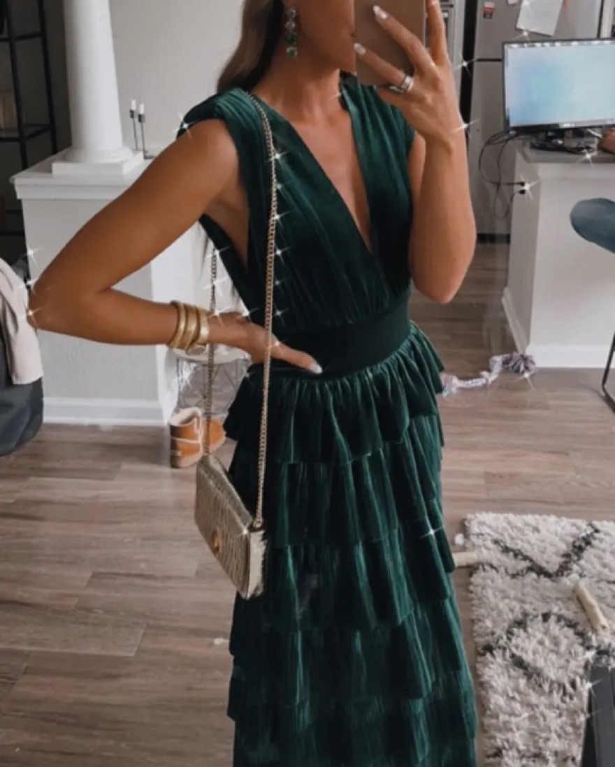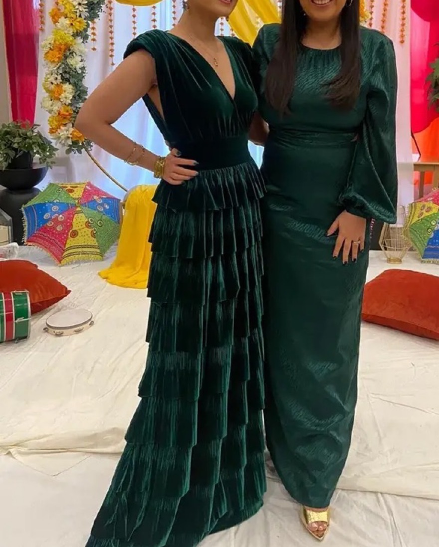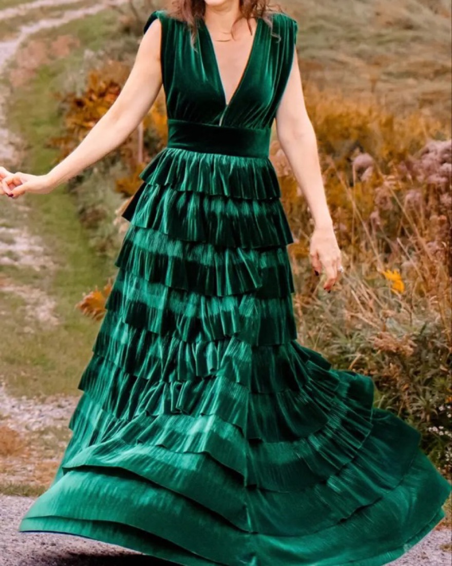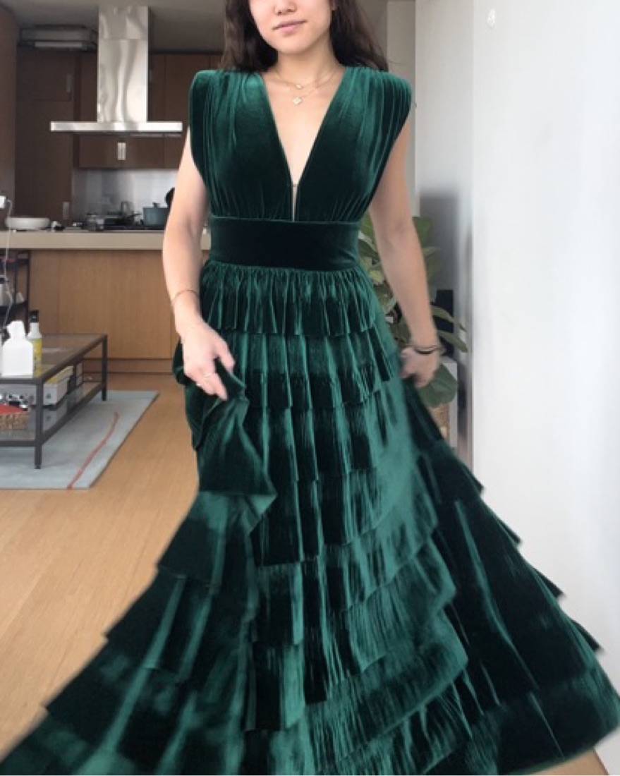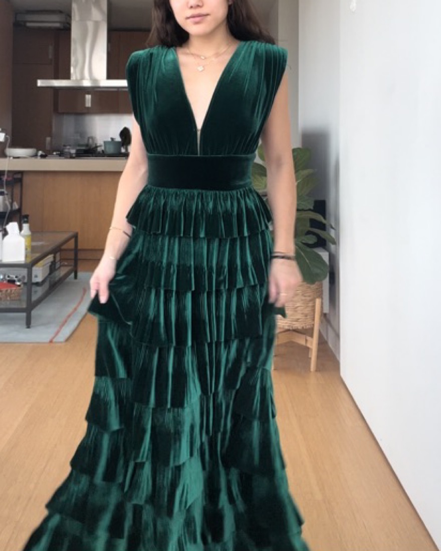 XS but runs big and can fit XS/S. Ruffled tiers and a plunging neckline shape this sumptuous emerald green velvet gown