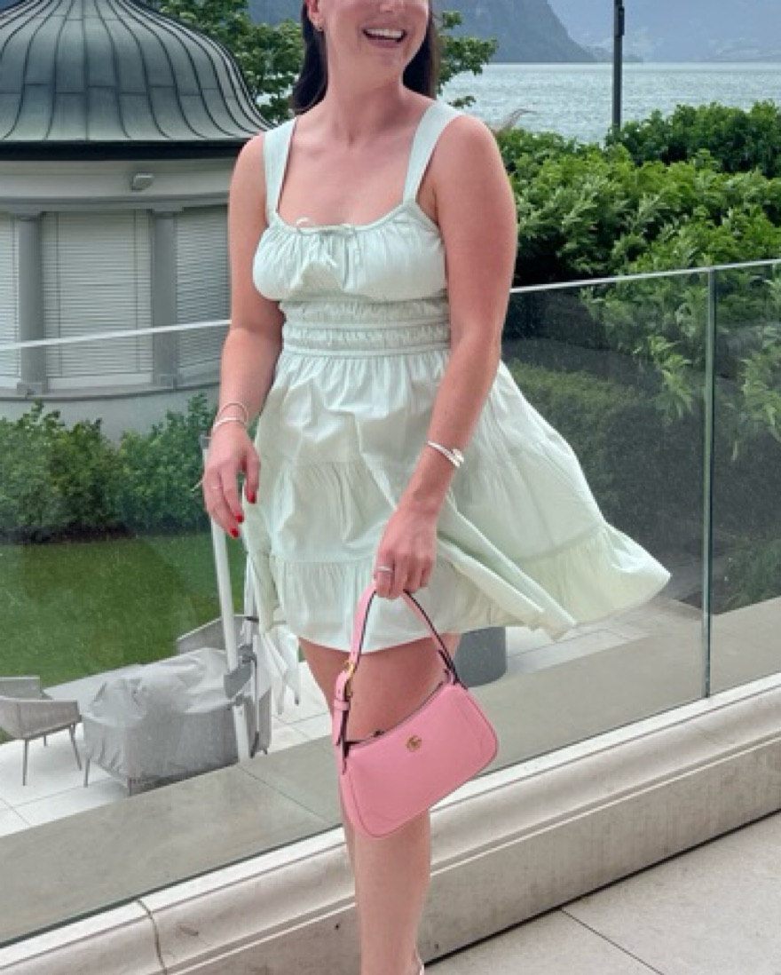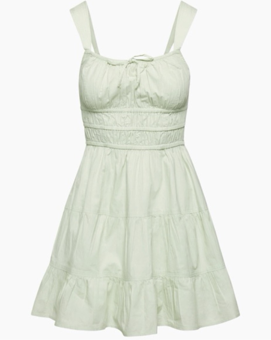 Tiered mini dress with elastic waist, a front tie detail and adjustable straps. It’s cut from 100% airy, lightweight cotton poplin with a smooth, crisp feel. Color is “soft chip mint”