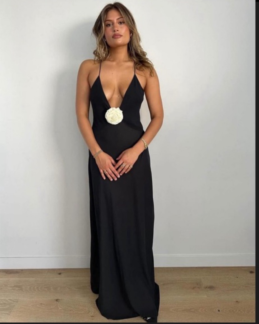 Helsa Black dress with white bow (white bow is detachable if you want just a black dress) super flattering!! Such a gorgeous dress. Fits size small. If you want to try on to see if it fits before renting - message me! Long dress, gown, maxi dress, gala, wedding guest, small, extra small, 0 , 2 , 4