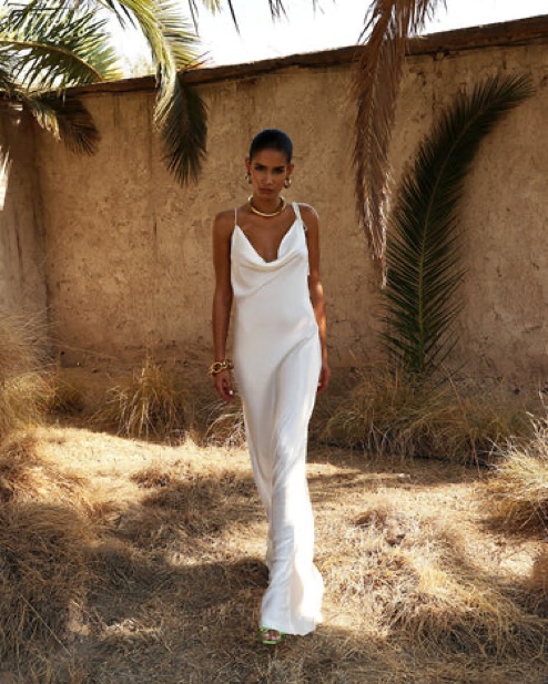 This dress is extremely flattering and is so beautiful. It is made of silk and had a long open cowl back with gold chain detailing. Only worn once - like new! Please return dry cleaned.