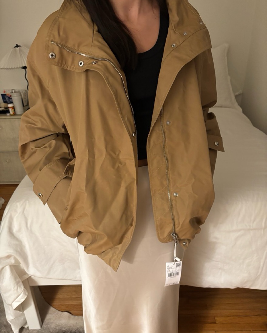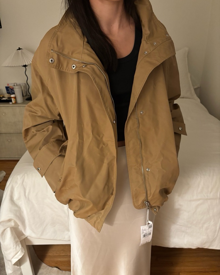 This versatile tan parka is perfect for layering and keeping warm on chilly days. The zipper details add a touch of edge to the classic silhouette.