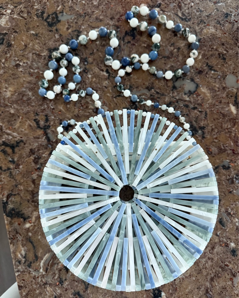 Unique circular design with blue, white and green colors. Fun matching beaded strap detail (which is removable). Flap closure at top.