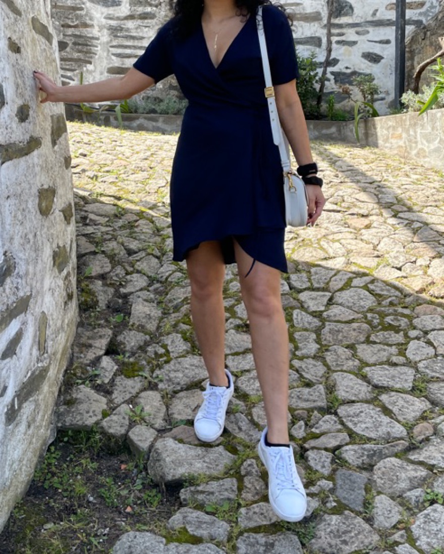 Effortlessly chic navy blue short sleeved wrap dress by Babaton. Perfect for day or night