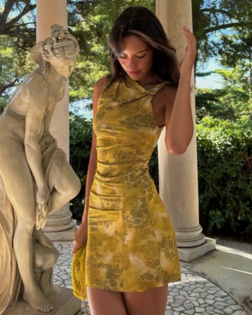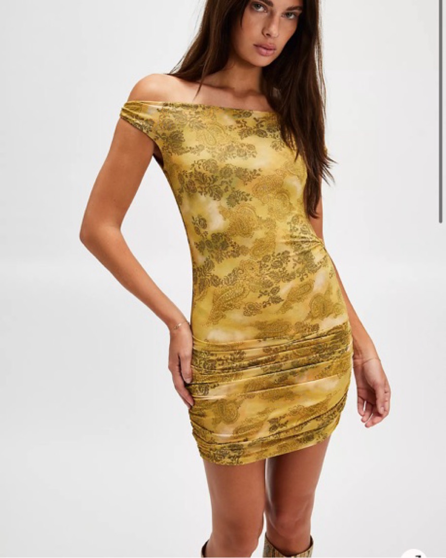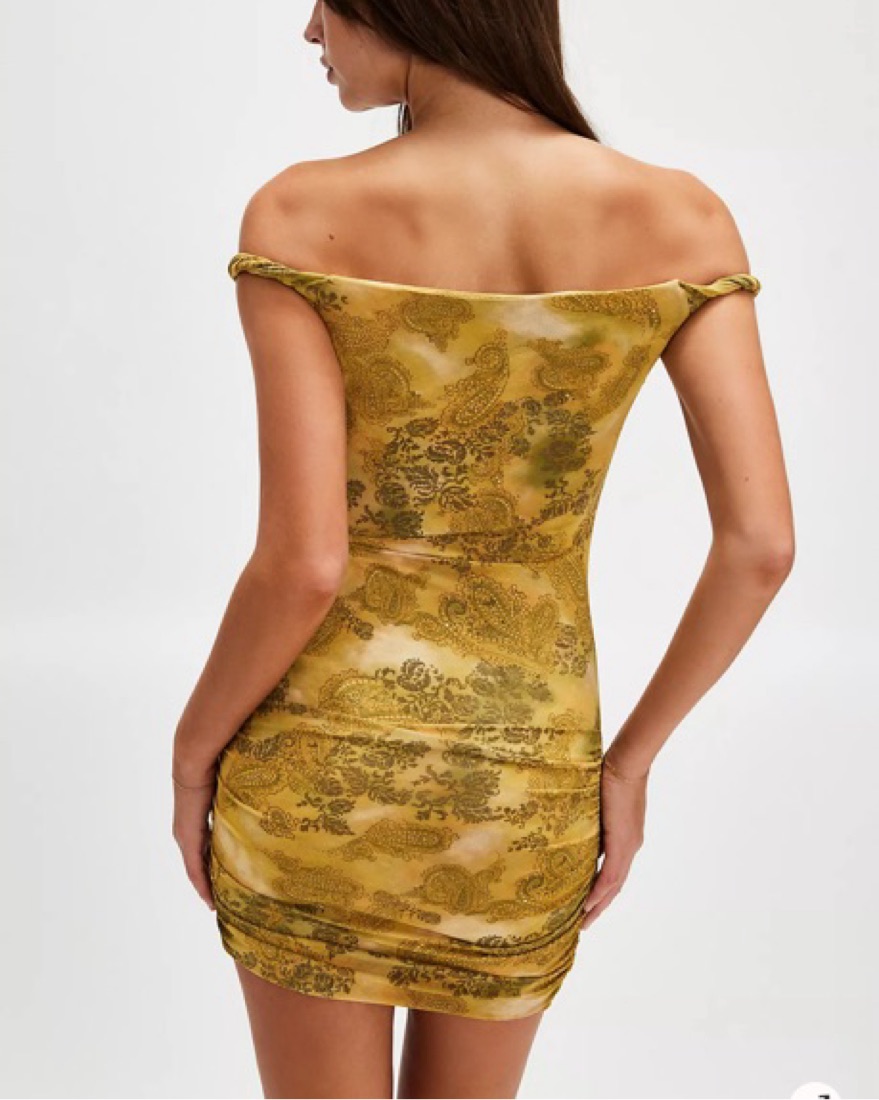 Stand out in this sweet yet sultry mini dress featured in a fitted silhouette and perfectly printed, ruched fabrication with knot-adorned neckline designed to be worn on or off the shoulder for added versatility. **Fit:** Bodycon fit **Features:** Knotted neckline, pull-on style, fitted design, ruch