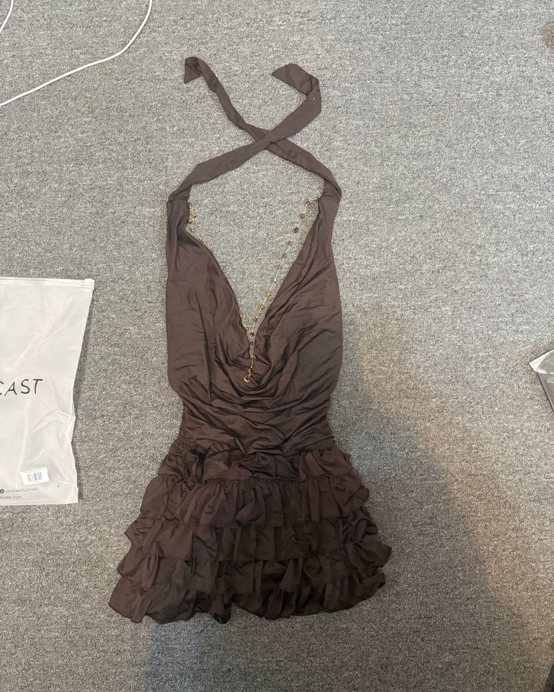 Chocolate brown halter mini dress with plunge neckline, attached chain detailing, and ruffles