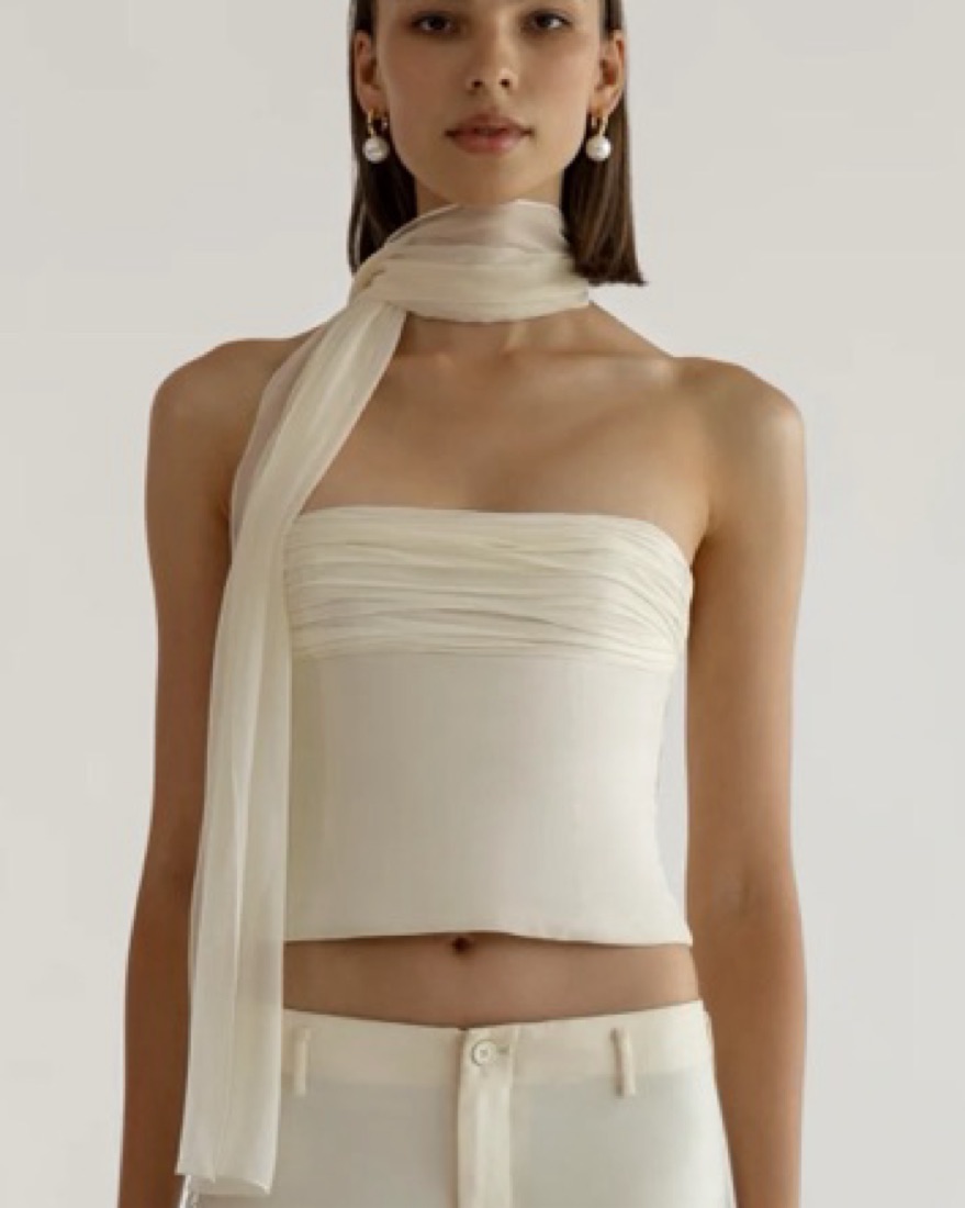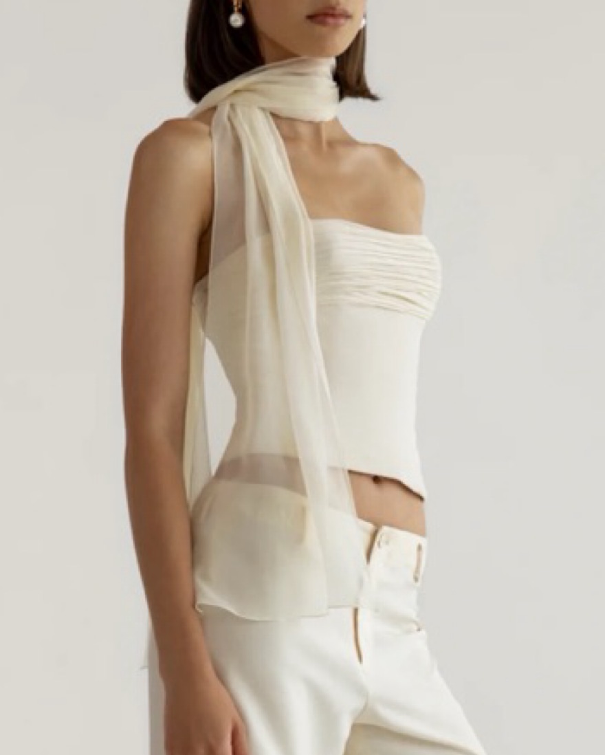 100% silk bustier with layered chiffon detailing. It is incredibly delicate so any damages will incur additional fees, please be careful!