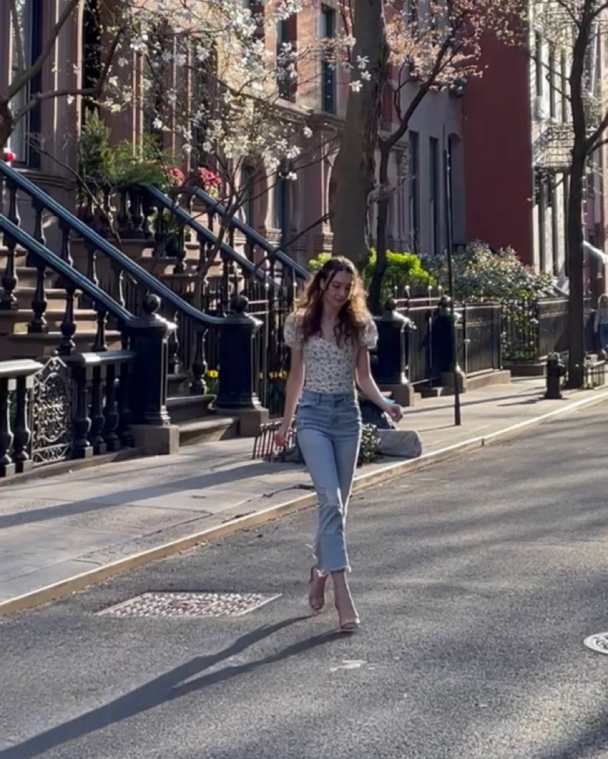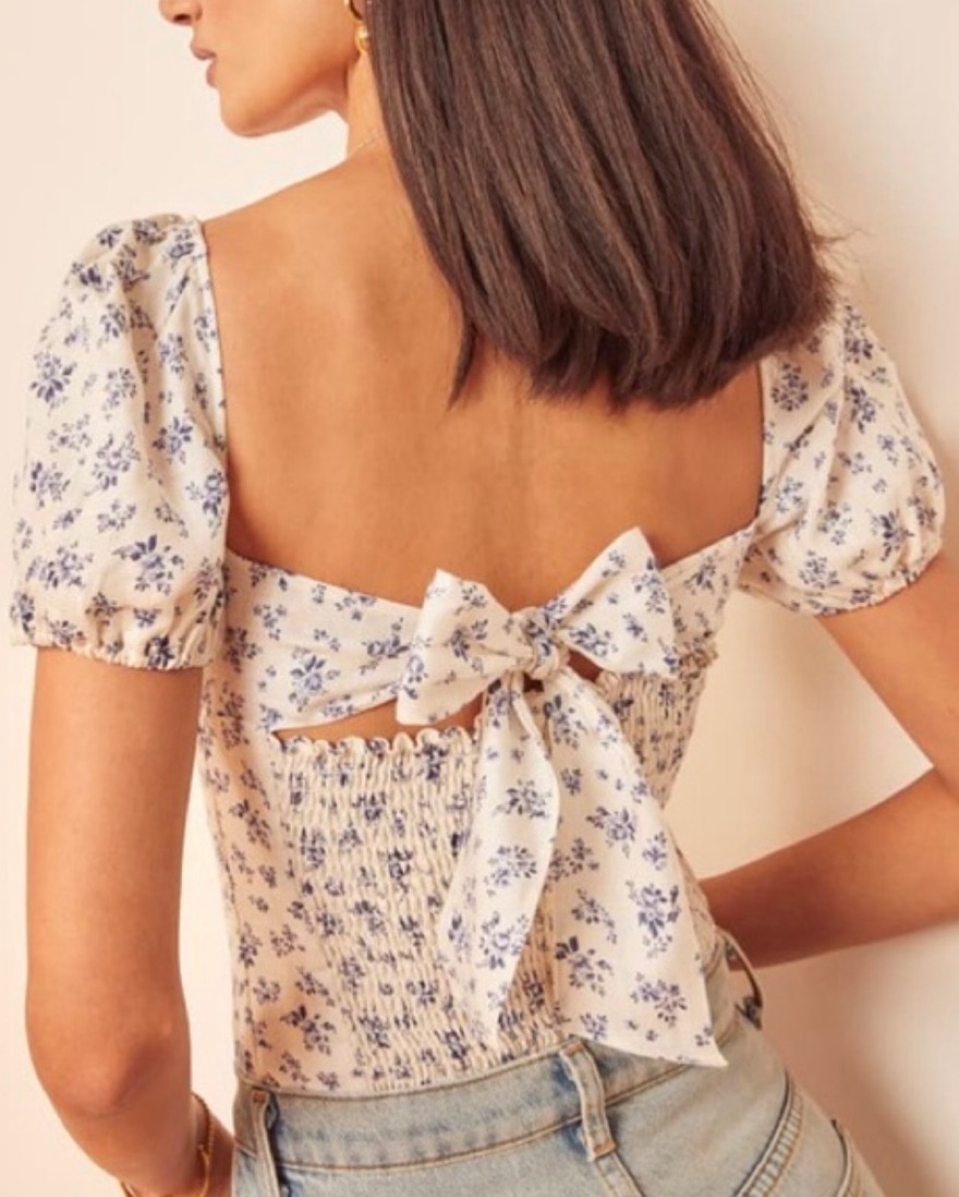 Reformation Casterly top in Gracie. This is a hip length top with a slight sweetheart neckline, puff sleeves, and a center back tie closure.