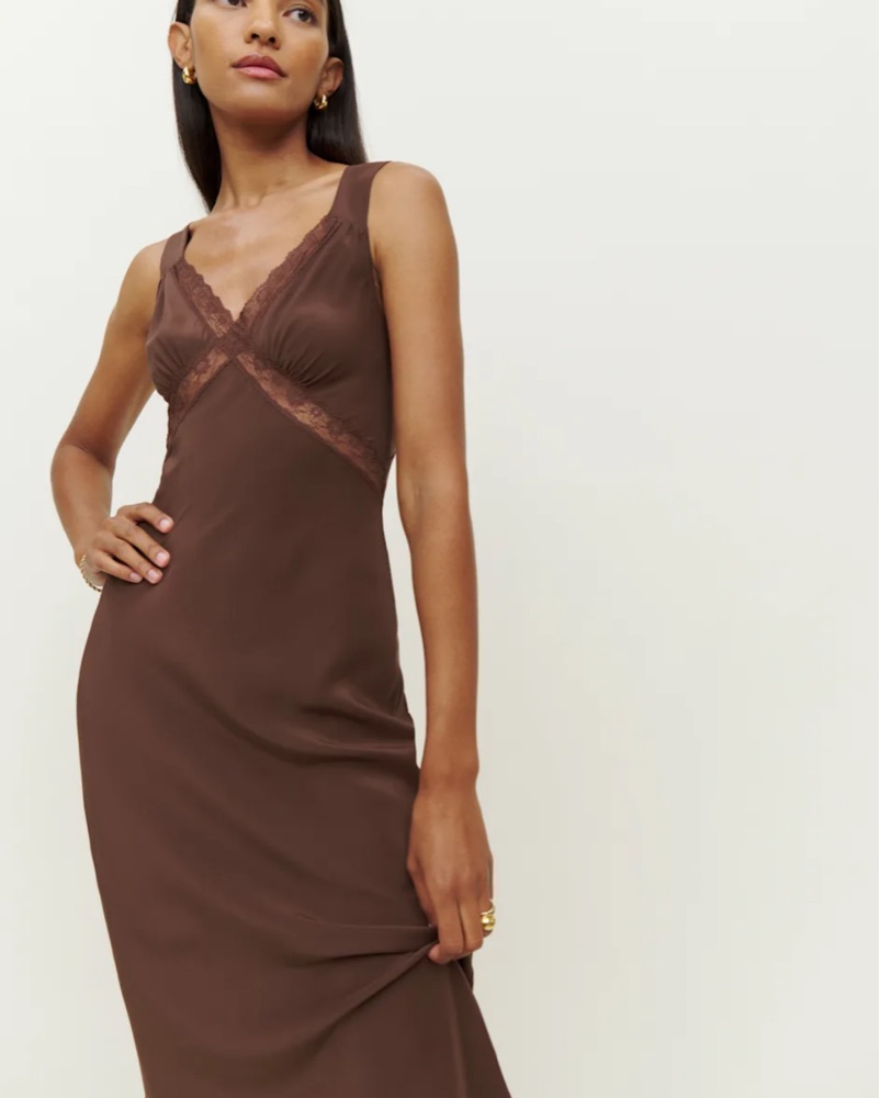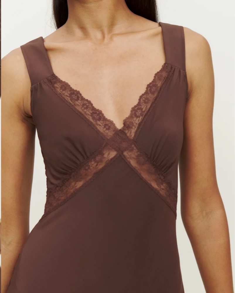Beautiful chocolate brown silk midi dress by Reformation. Open back and lace details. Hem comes to mid-calf in 5’5” body. Recommended for smaller chest sizes. No longer sold.