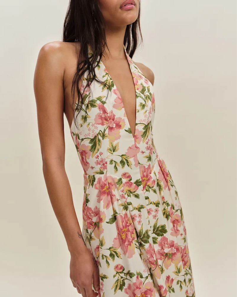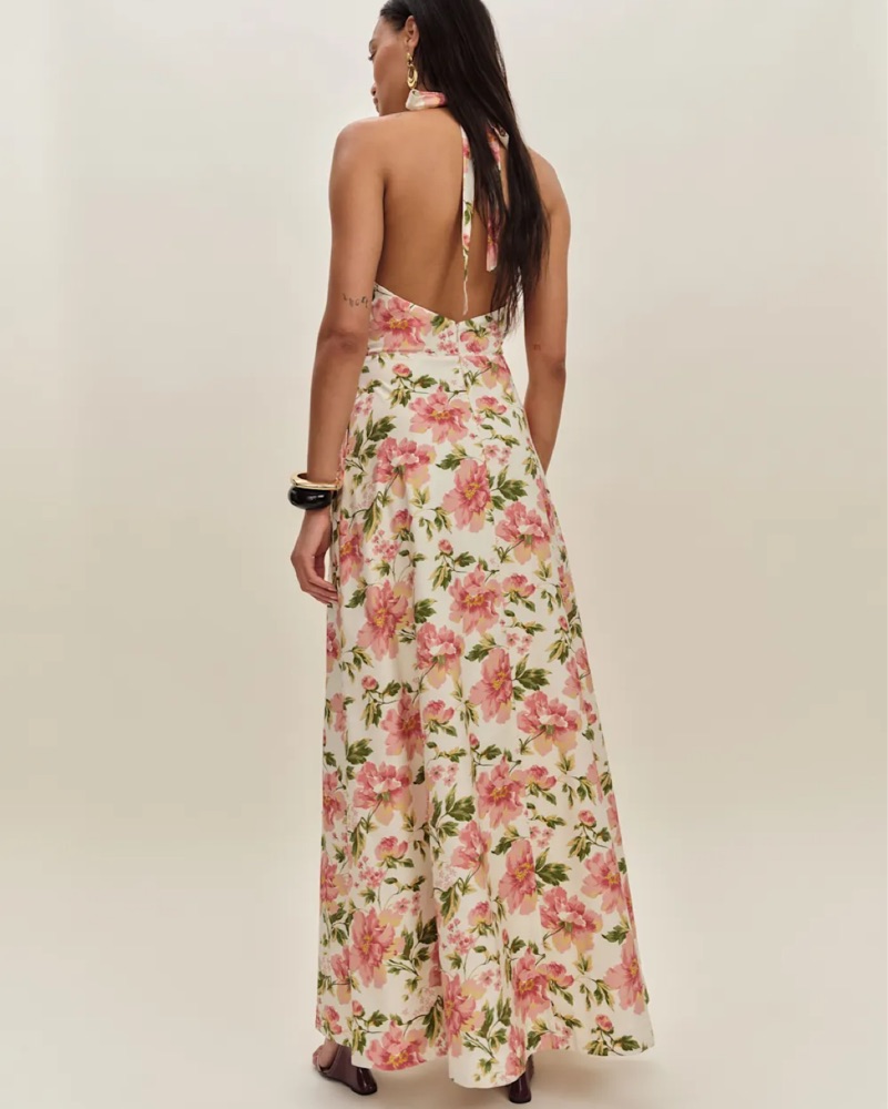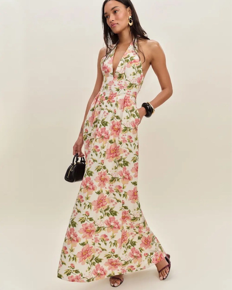 Never worn, with tags. This stunning floral maxi dress is perfect for any summer occasion, from a garden party to a beach wedding. The vibrant floral print and halter neckline create a chic and feminine look.