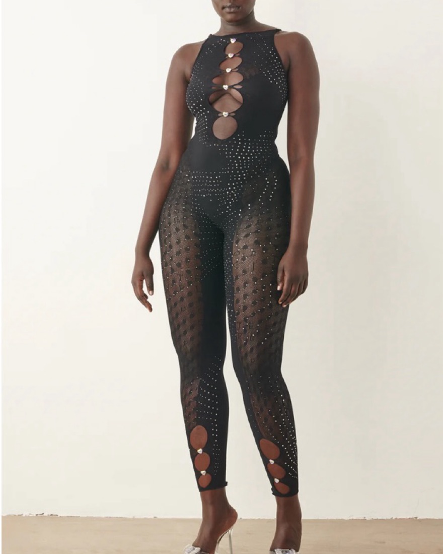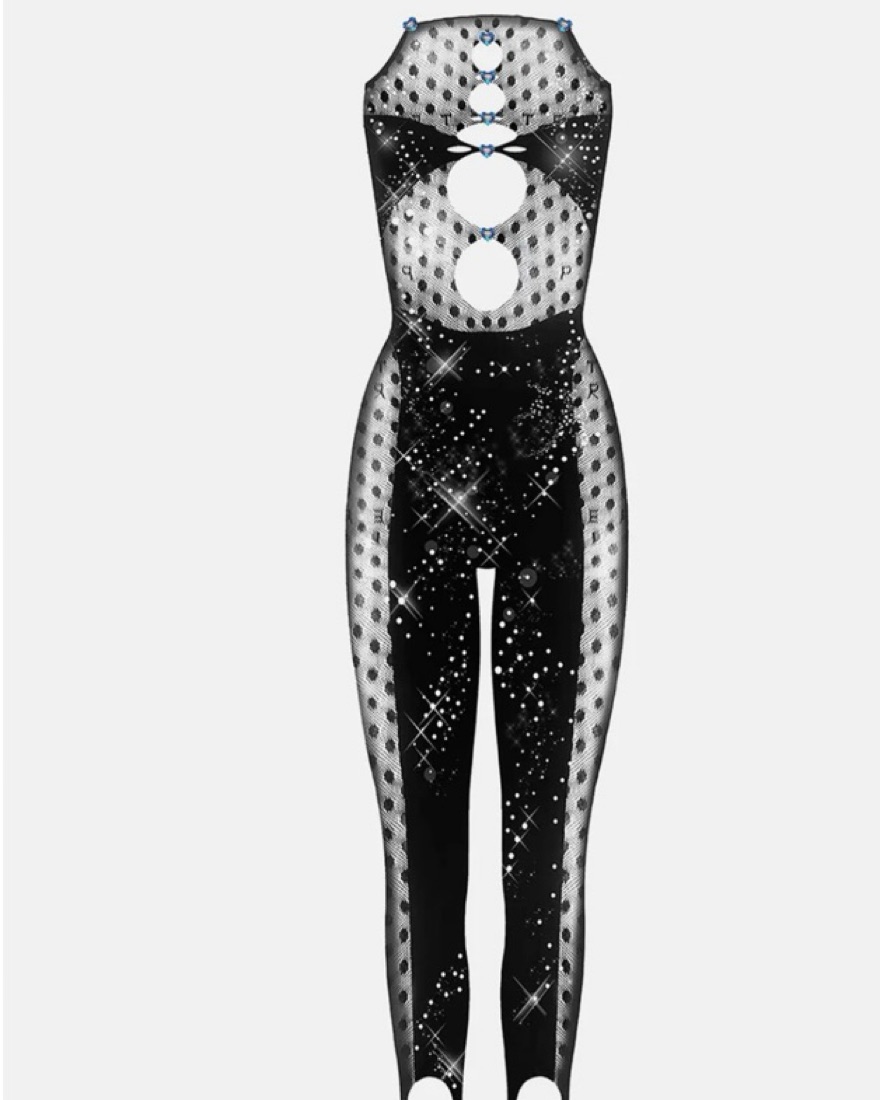 Murmurations of iridescent rhinestones swarm front & back, iconic cutout peep holes descend on the bust & legs, and our signature suctioning shapewear sweeps your curves to perfection. Handle with care. Don't wash, owner dry cleans