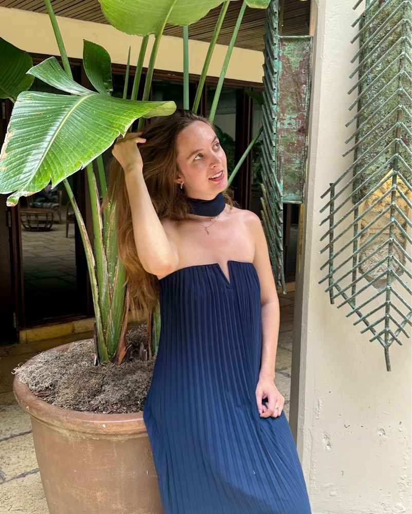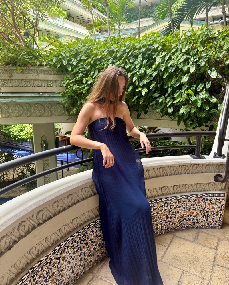 This stunning navy blue pleated maxi dress is perfect for a special occasion like a wedding or formal event. The flowing silhouette and elegant pleating create a sophisticated and glamorous look.