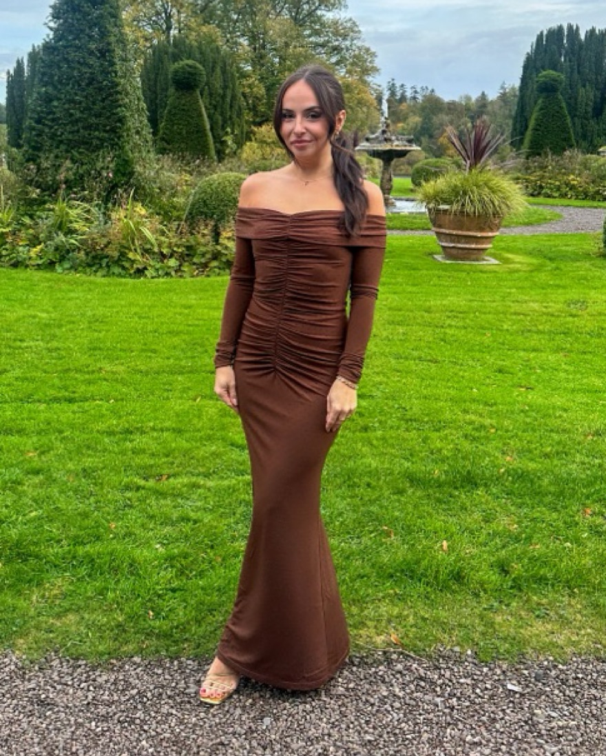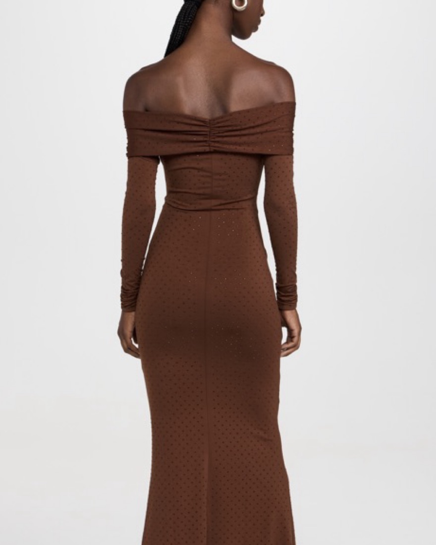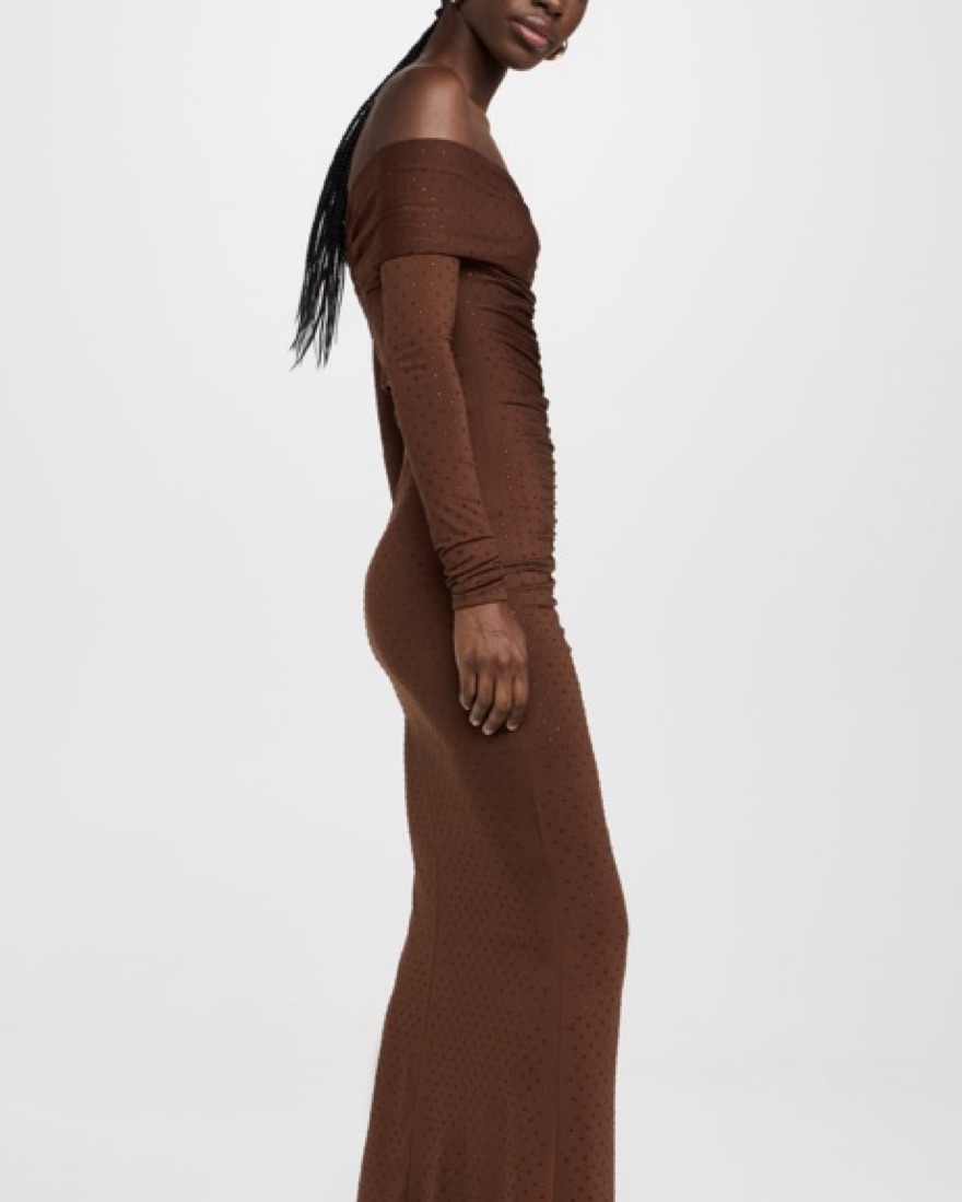 Brown off-the-shoulder Bardot dress covered in rhinestones, size small. Good for short girls! I’m 5’2 and the length worked for me with heels