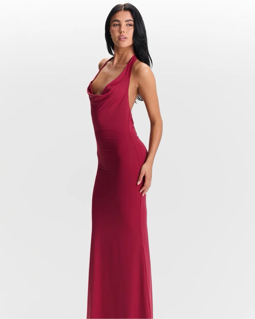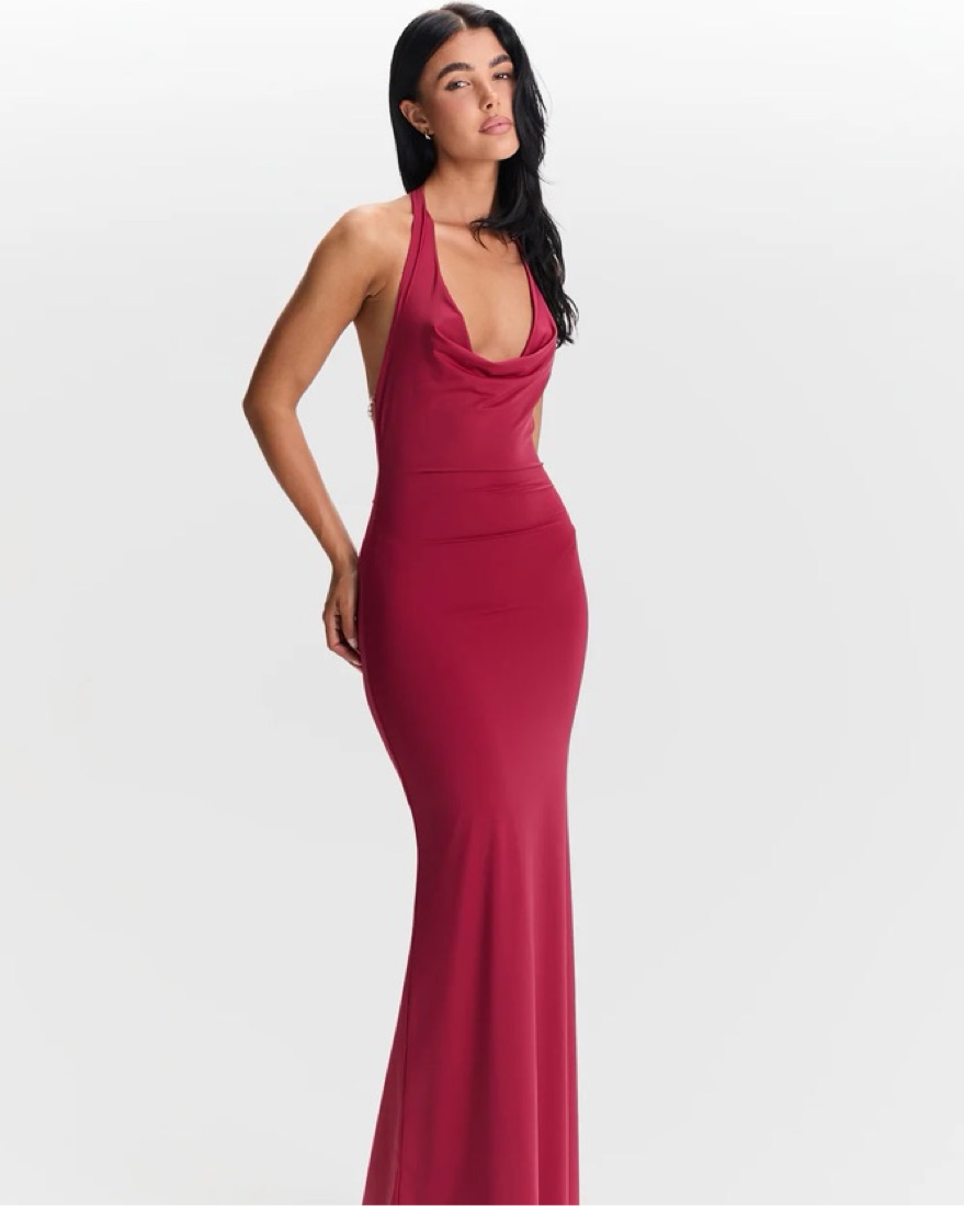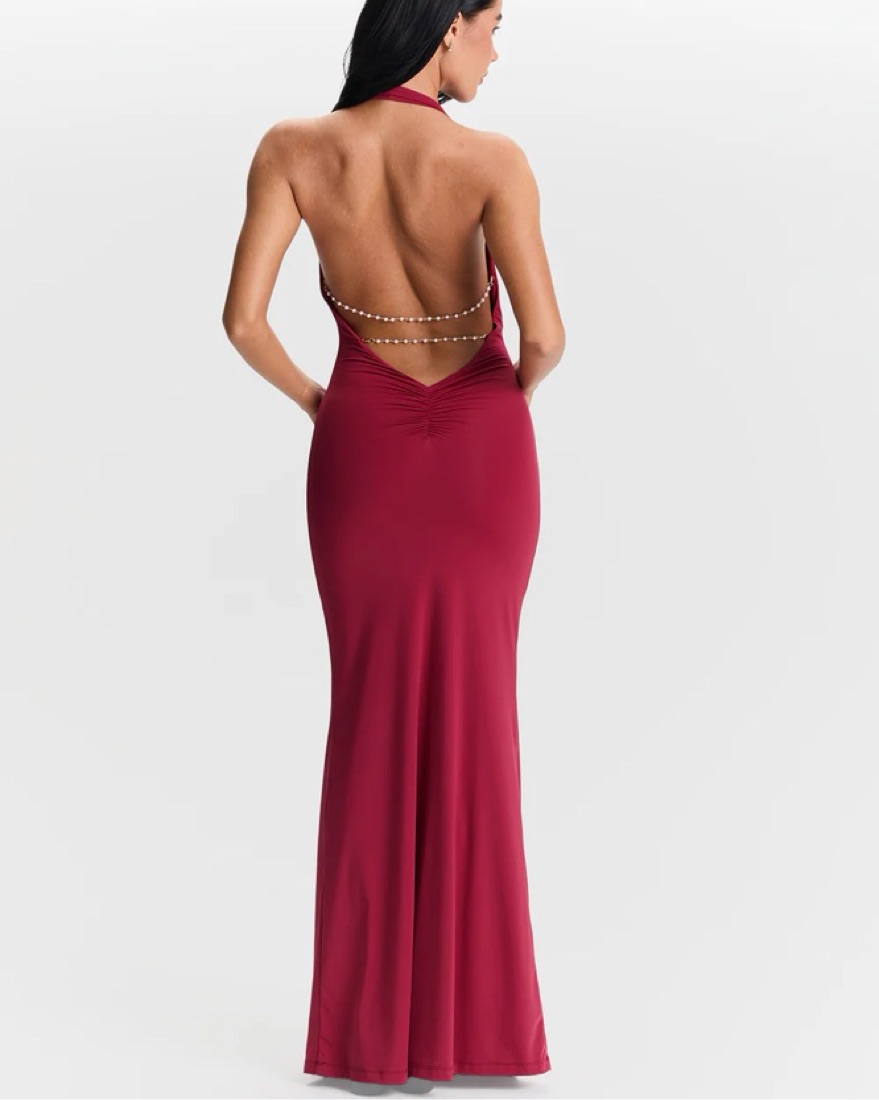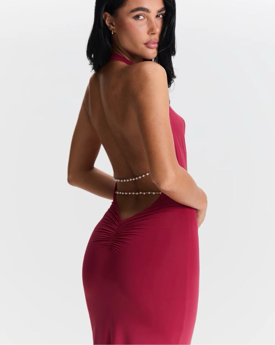 Sasha Therese Harper Maxi Dress in Cherry Red. Super soft material. Plunging cowl neck with an open back adorned by signature pearl chains (can be removable). Brand new never worn! Size XS. Fits XS/Small 2/4