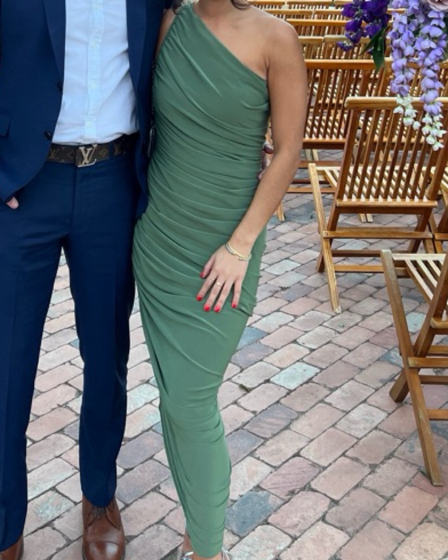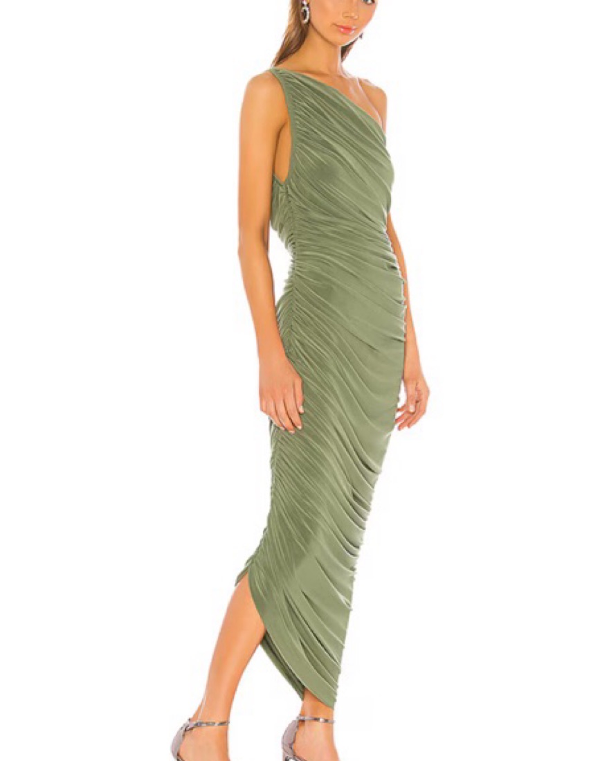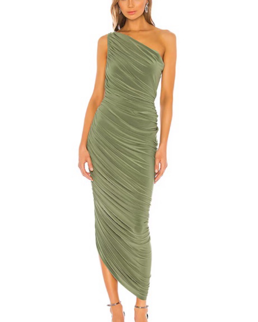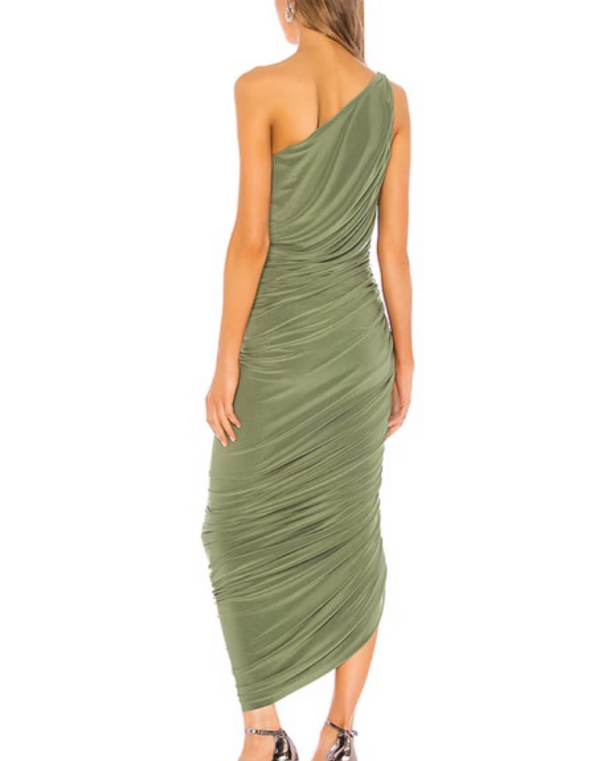 This chic one-shoulder dress in a stunning olive green hue is perfect for formal events or special occasions. The draped, ruched design creates a flattering, figure-flattering silhouette.