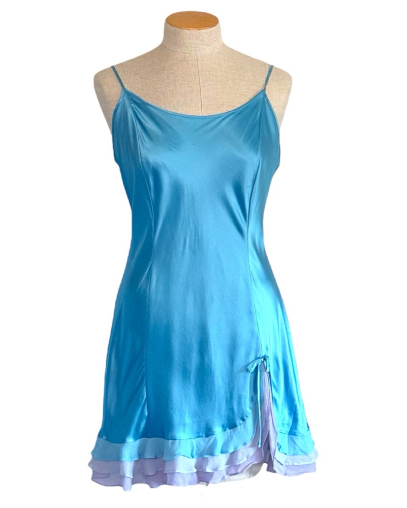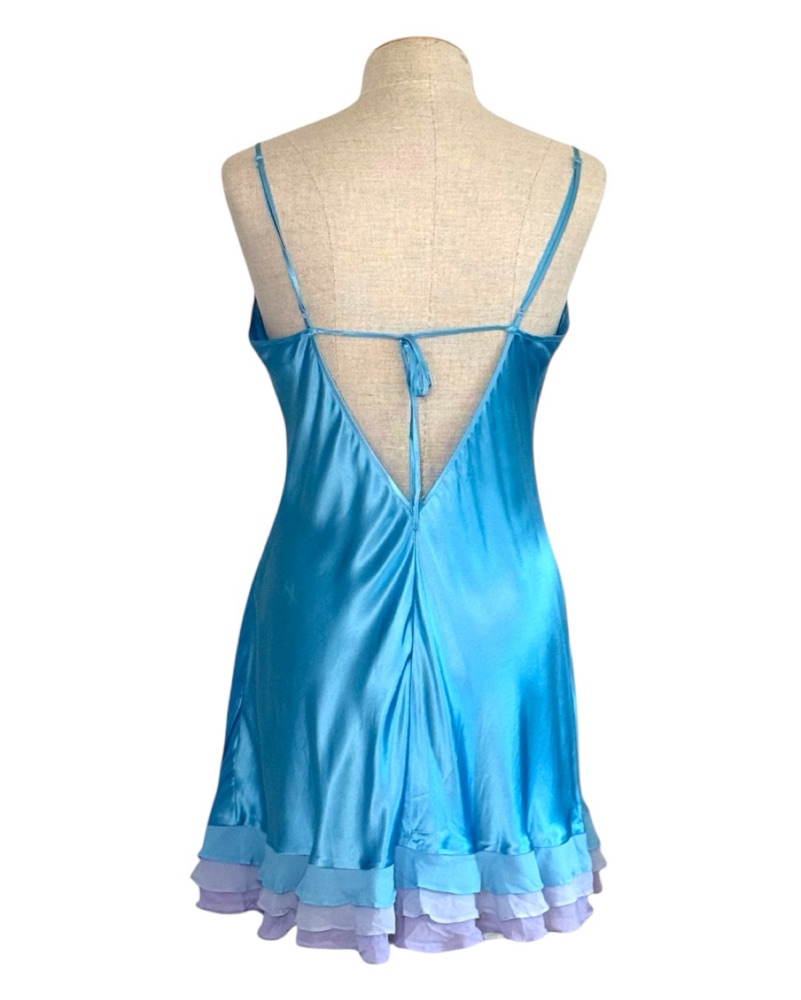 This stunning blue 100% silk mini slip dress with multi-color ruffles and adjustable straps is perfect for a night out on the town. Pair it with heels and fur for a chic and stylish look. Flawless condition.