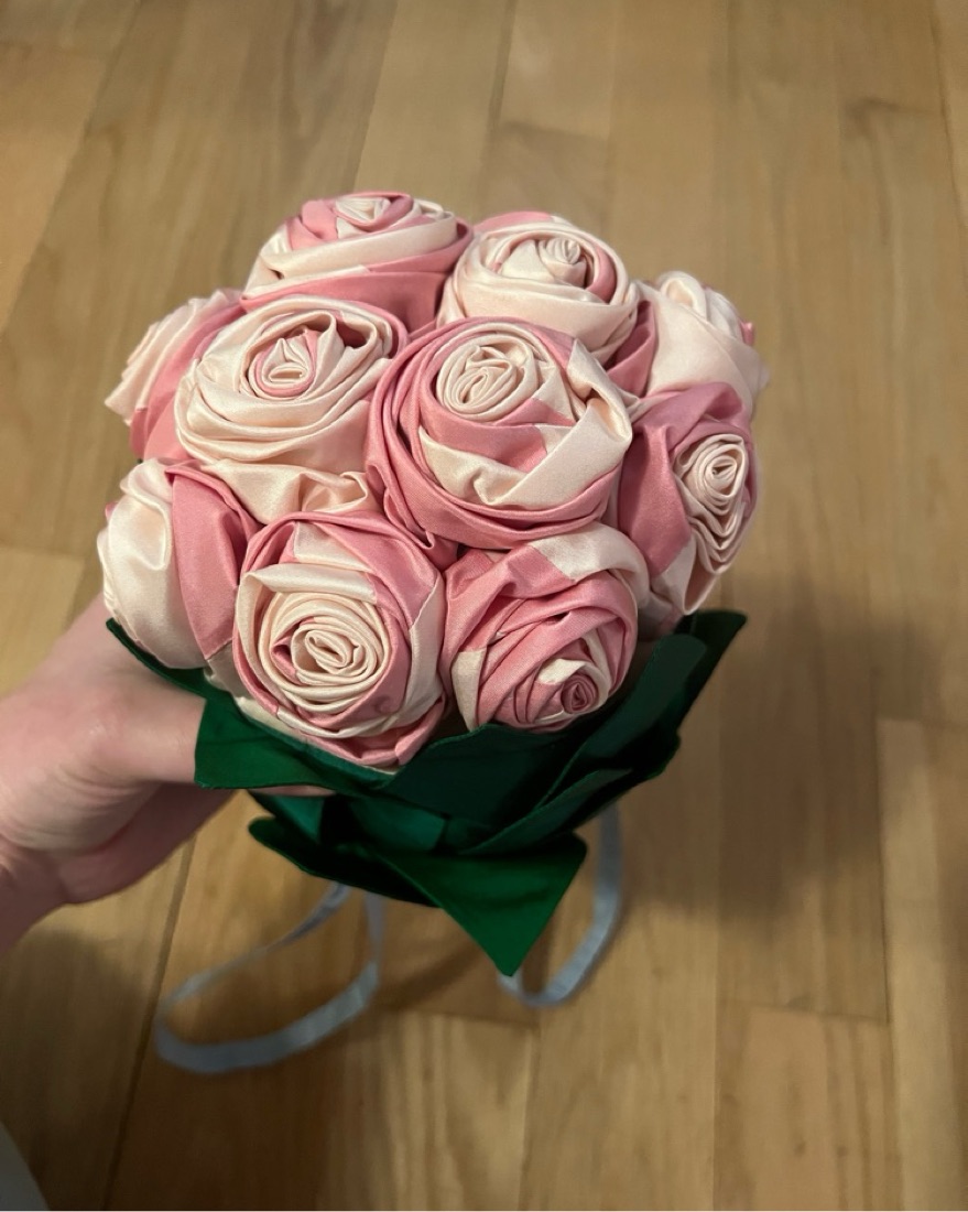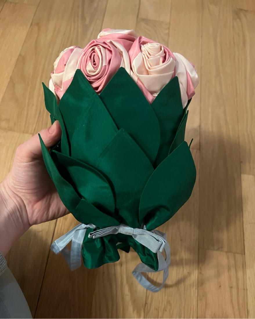 Ivory and pink roses, hunter green leaves, pale blue bow.