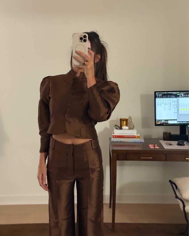 Brown taffeta. I am 5’3 for reference. Blazer is XS and bottoms are FR 34. Can be rented separately or together. Pants are ‘cropped’ but long on me, looks great either way though