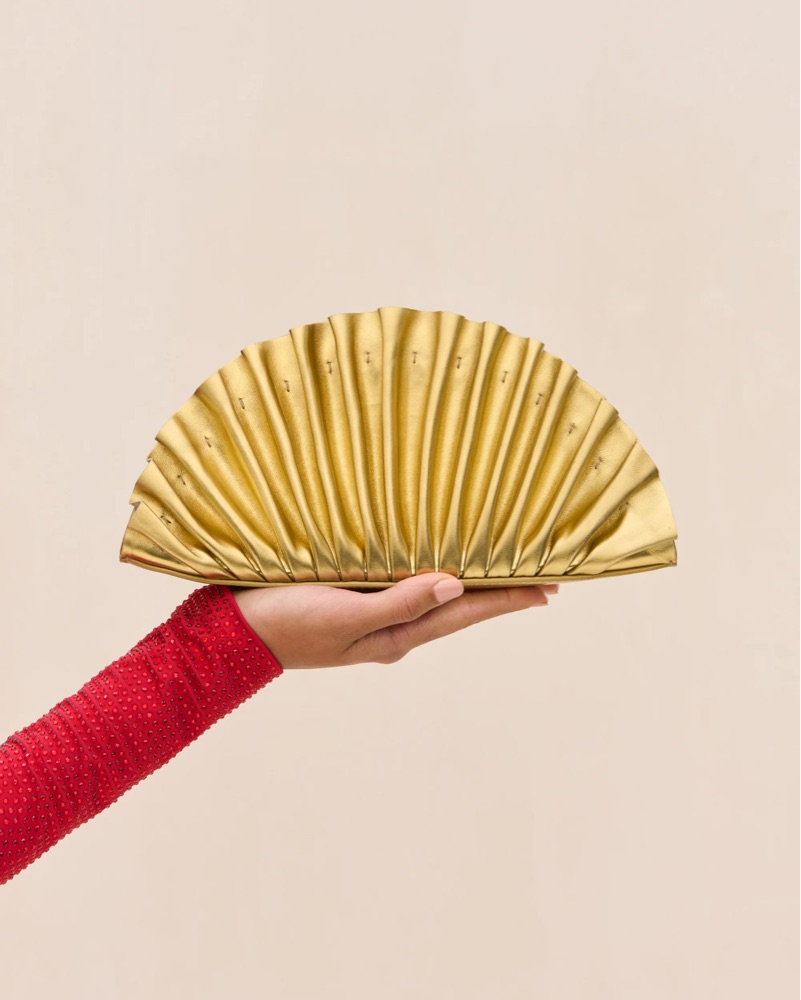 This statement-making clutch adds a touch of glamour to any ensemble. Perfect for elevating your evening look with its chic, metallic fan design.