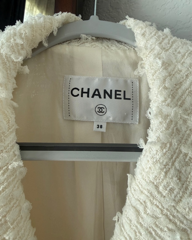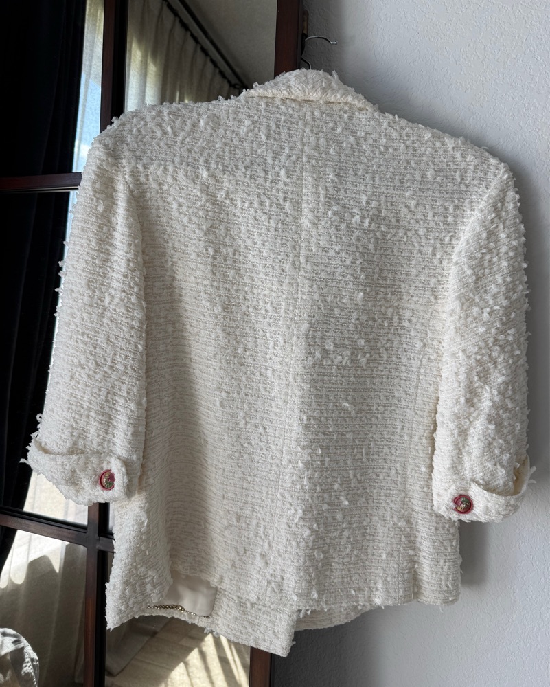 Chanel Blazer • From the Pre-Spring 2017 Collection by Karl Lagerfeld • White • Tweed Pattern • Bouclé Pattern • Shawl Collar • Patch Pockets & Button Closure