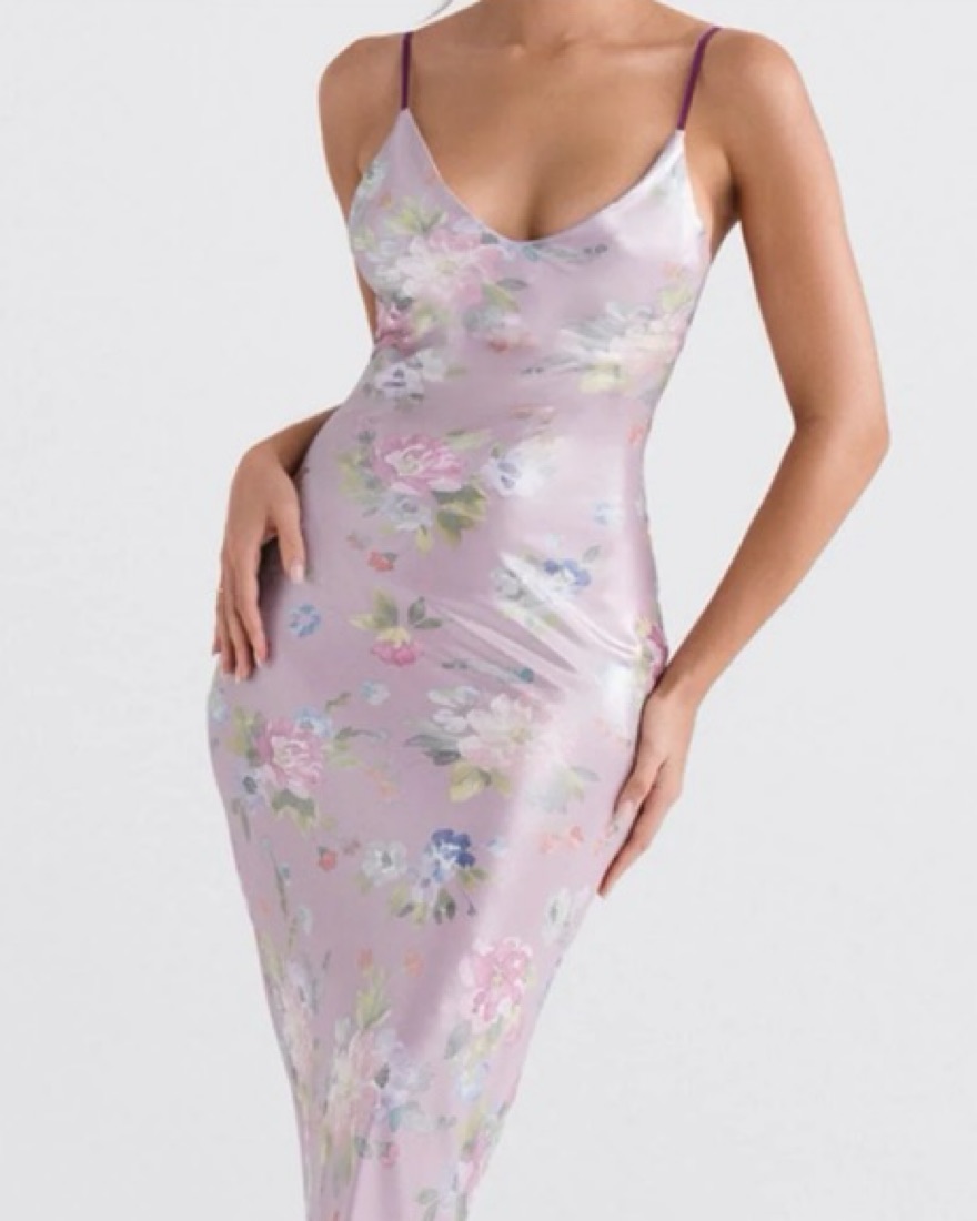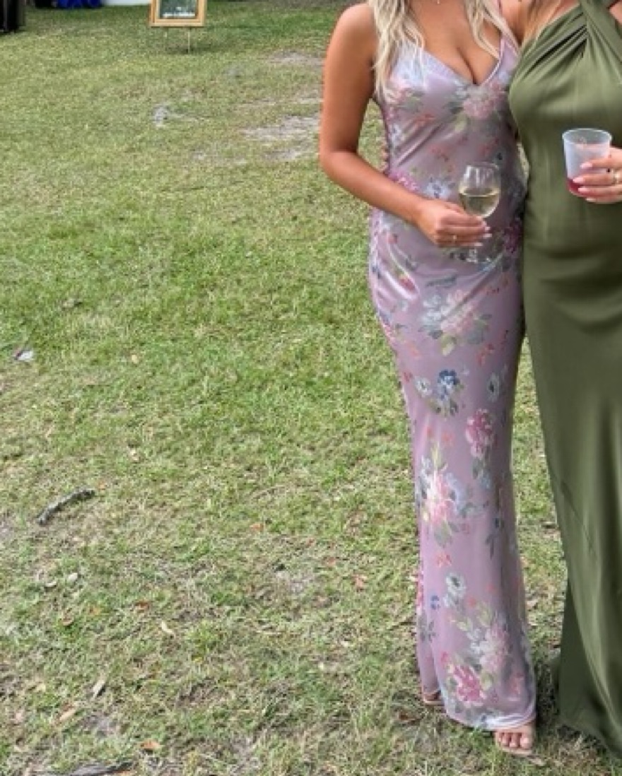This stunning maxi dress features a flattering floral print in a beautiful color palette. Perfect for a special occasion like a wedding or formal event.