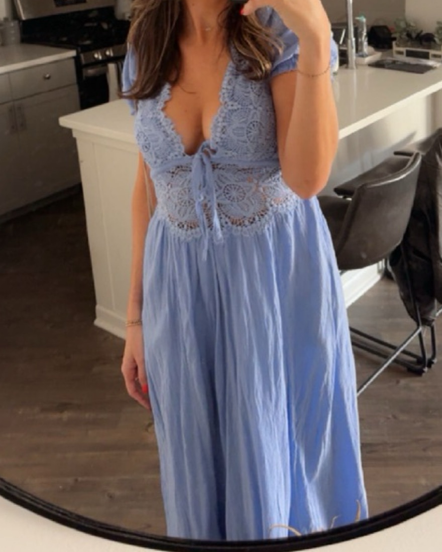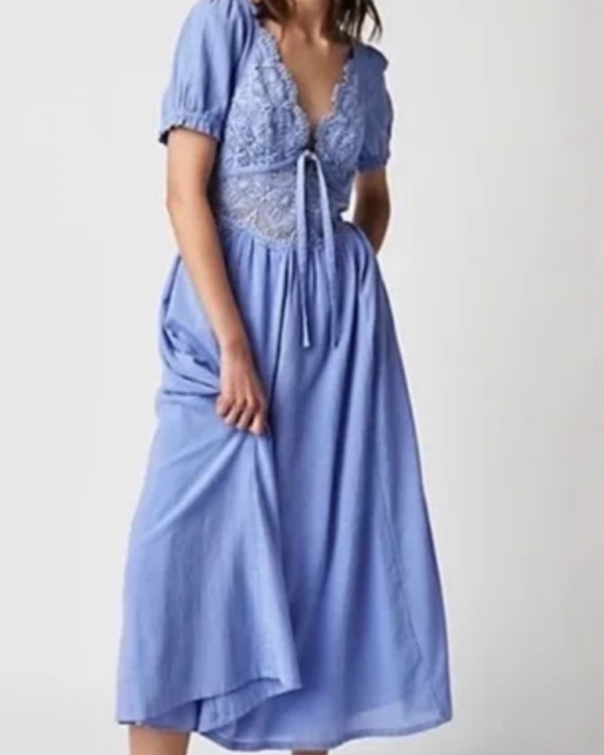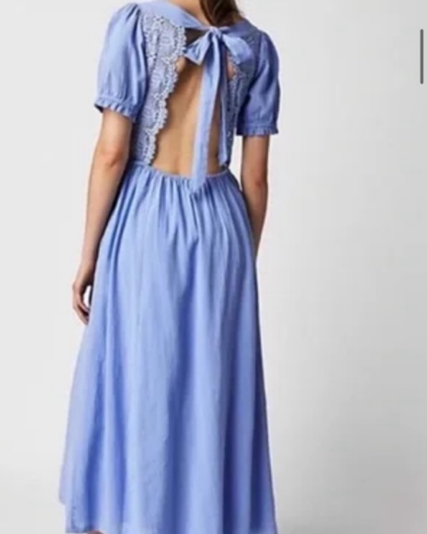 Lovely in lace: this is a stunning midi in color misty dawn (light blue/lilac). Fit: Relaxed, A-line silhouette.Features: Lace-adorned bodice detail, scalloped V-neckline, front tie keyhole feature, puffed sleeves, exaggerated open back