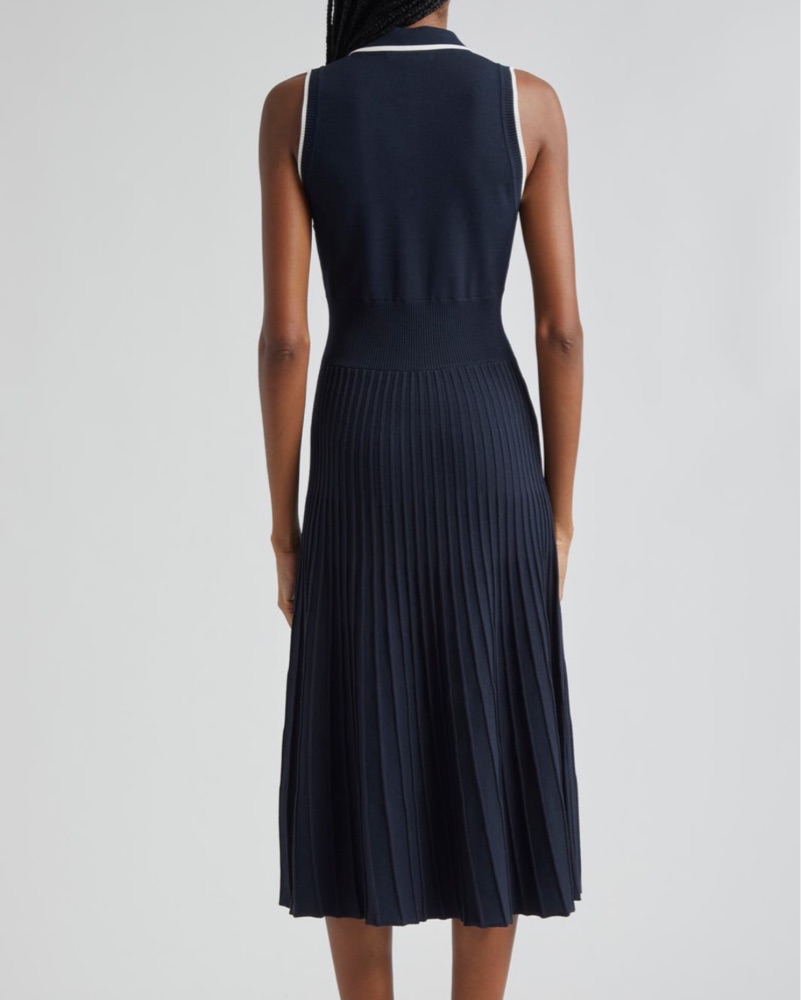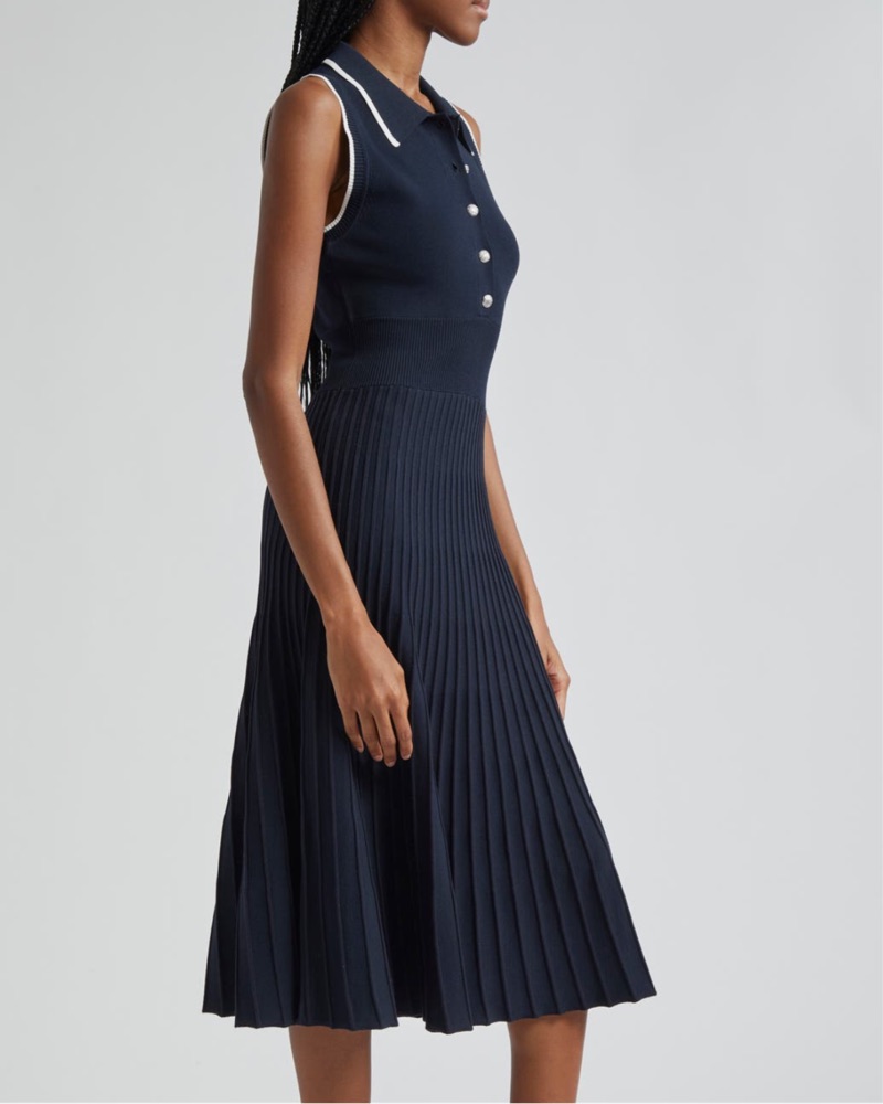 Nautical hues and crested buttons polish a knit shirtdress crafted in a sleeveless silhouette. Perfect for work or walking in European cities. Navy blue