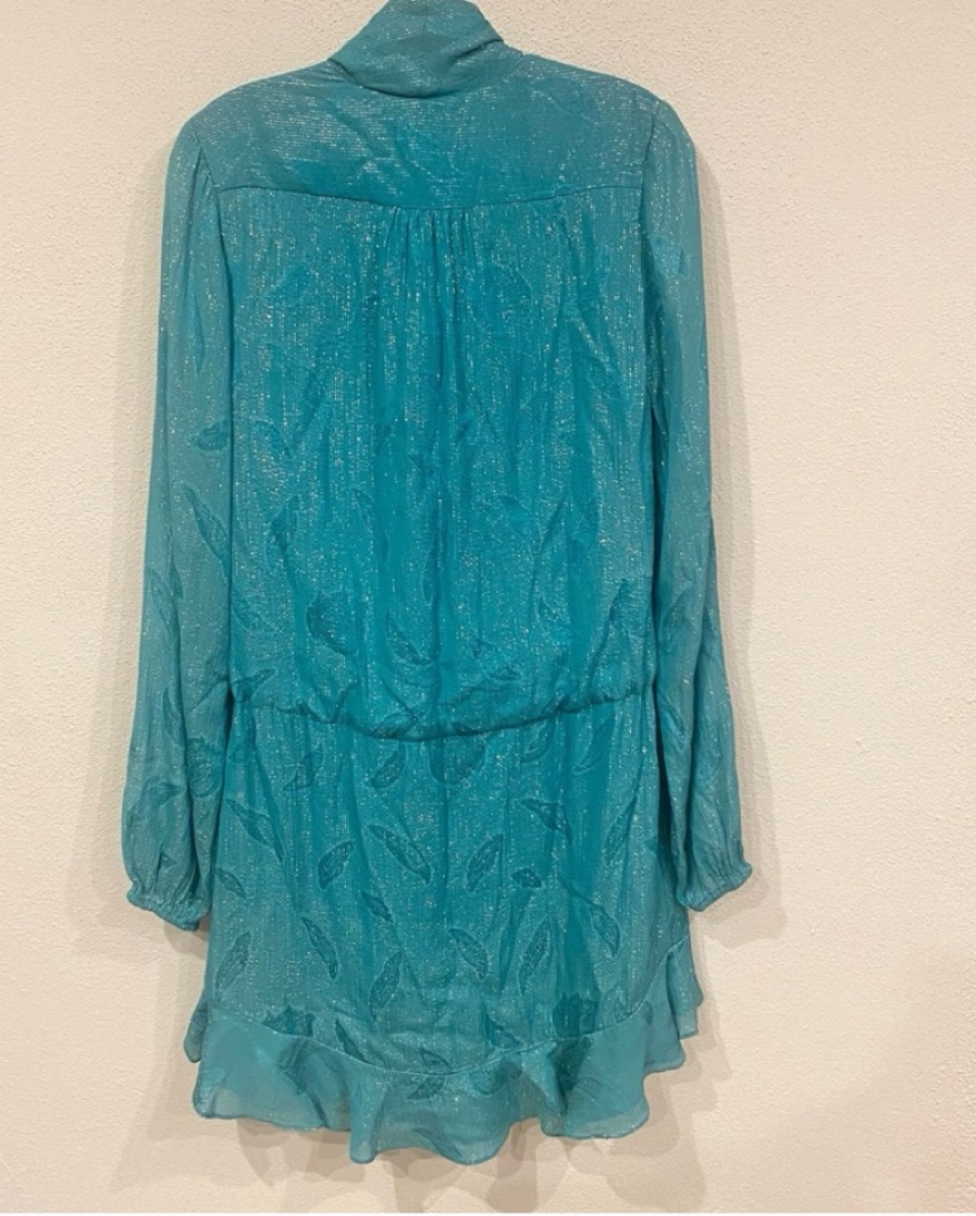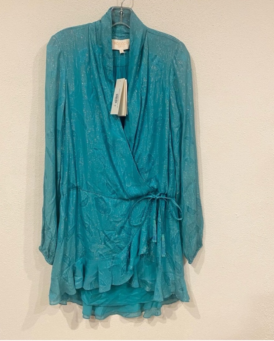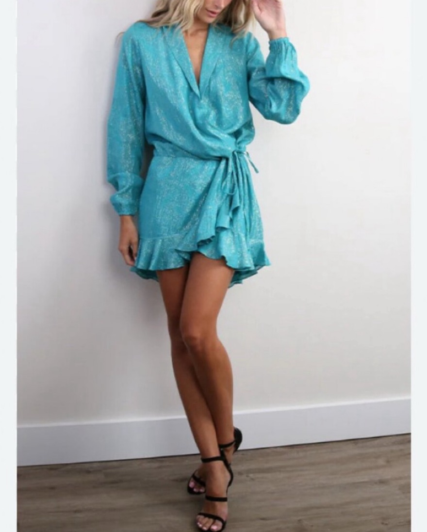 Party season has officially started. Time to refresh those dressy looks with this fun, statement mini. Featuring a wrap style silhouette, v neckline, long blouson sleeves, ruffle hem and a tie waist. Style with strappy shoes and gold hoops.
