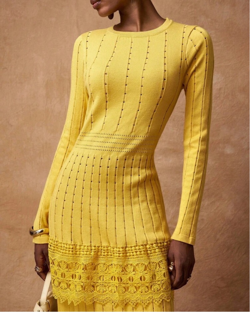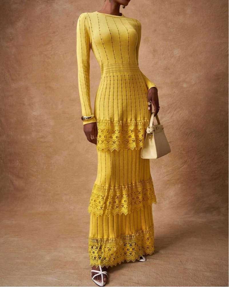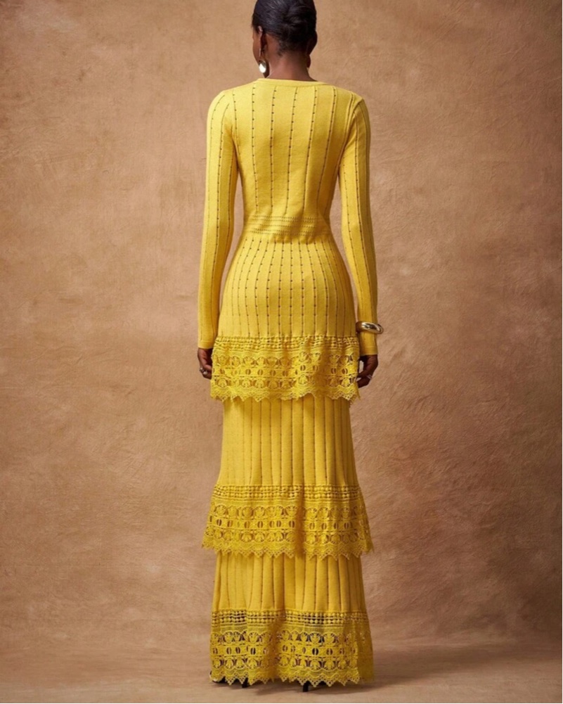 Elegant yellow maxi dress with a flattering slim fit and beautiful lace tiered detailing. Features a round neckline, long sleeves, ribbed knit texture, and medium stretch for comfort. Statement piece for formal events, dinners, parties, vacation, or special occasions.
