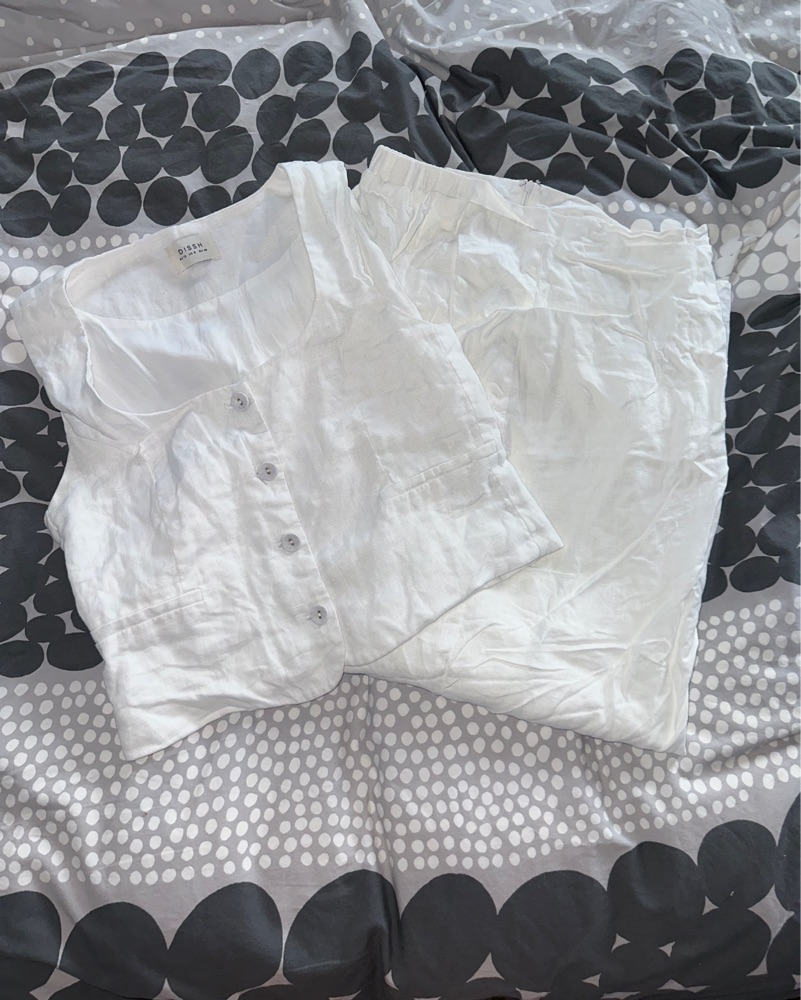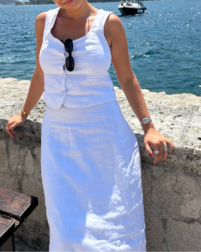 Oscar Scoop Neck Linen Vest (bought an 8 but took it in slightly so it’s now probs a 6) + Roberts White Linen Skirt size 6 unaltered ! both worn 1x last summer as pictured will steam before delivery!