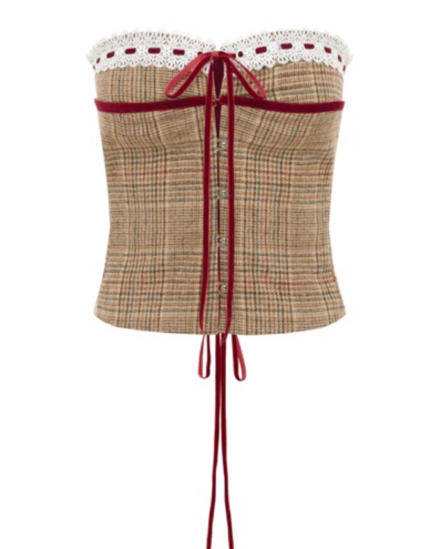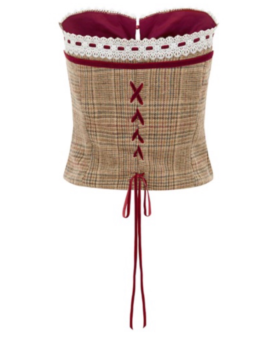 strapless corset style top with a hook and eye front closure featuring a lace detail bust and lace up ribbon back! I can only dry clean this item so dry cleaning fees worked into overall rent price:)