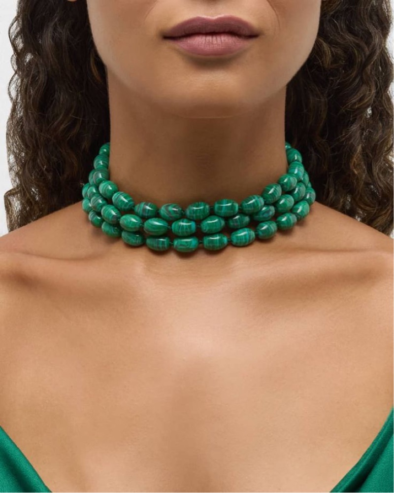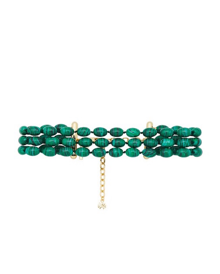 Three twisted hand strung malachite bead strands ∙ 14k gold plated hardware ∙ Lobster claw clasp ∙ Measures 13" with 4" extender