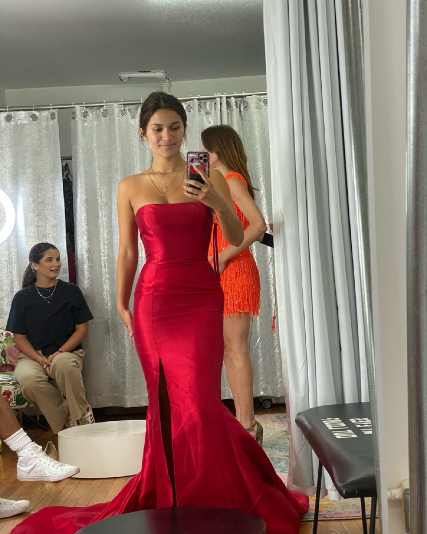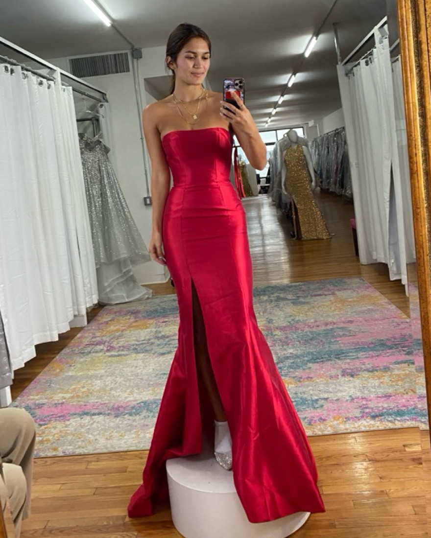 Strapless, red long cinched at the waist ball gown with a high slit. It has a very long train! Good for holidays, Christmas, gala