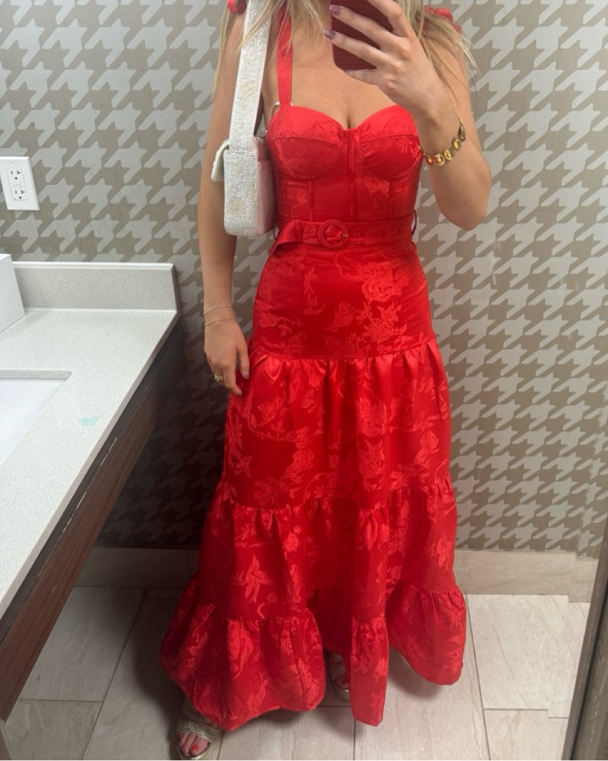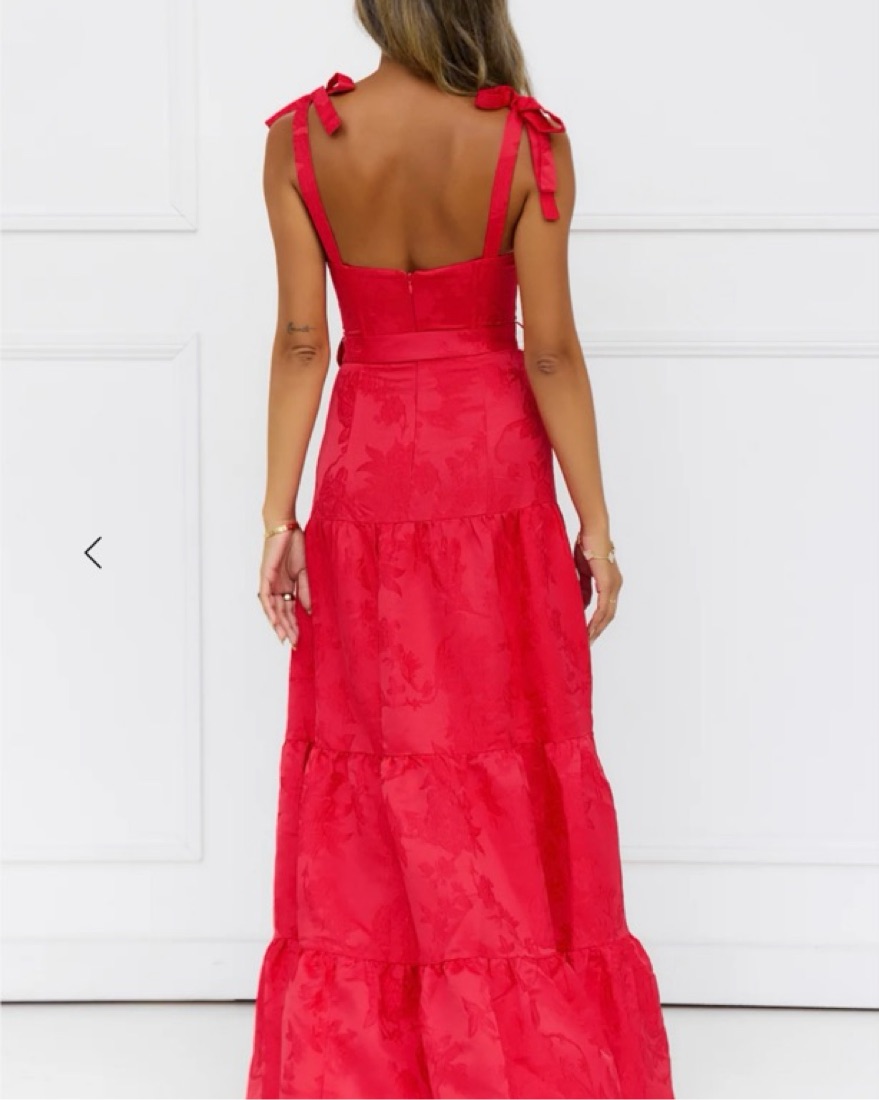 Padded cups. Flowy skirt. Boning to bodice. Zipper, hook eye closure Waist belt. Tie up shoulder straps. Textured fabrication