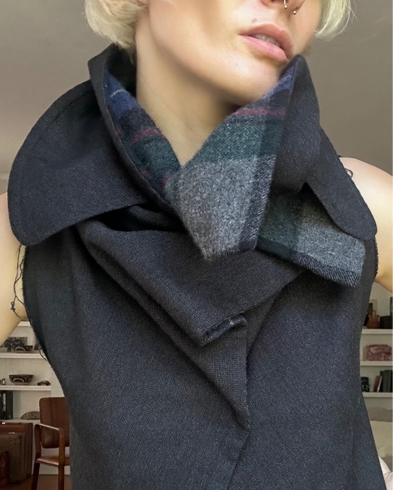 Grey wool exterior with dramatic sculptural collar and concealed tartan wool lining.