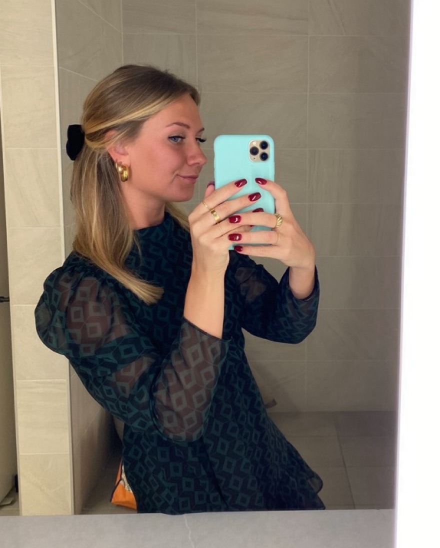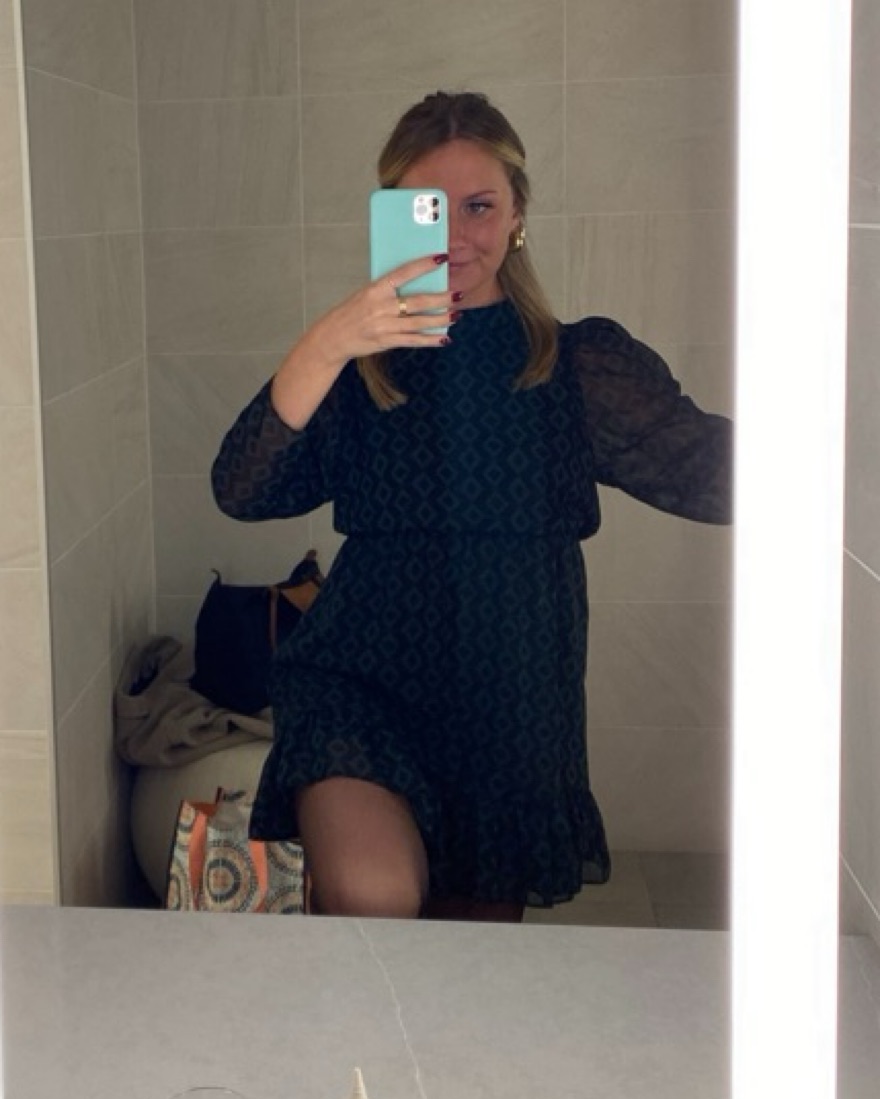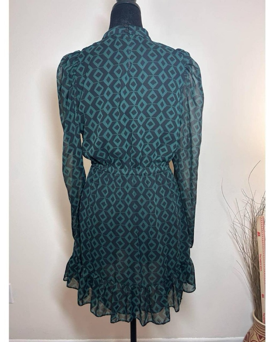 green & black pattern long sleeve dress. wore for a corporate work holiday party with black tights and it was perfect! Only the sleeves are sheer & dress is tasefully above the knee. xs but can fit small