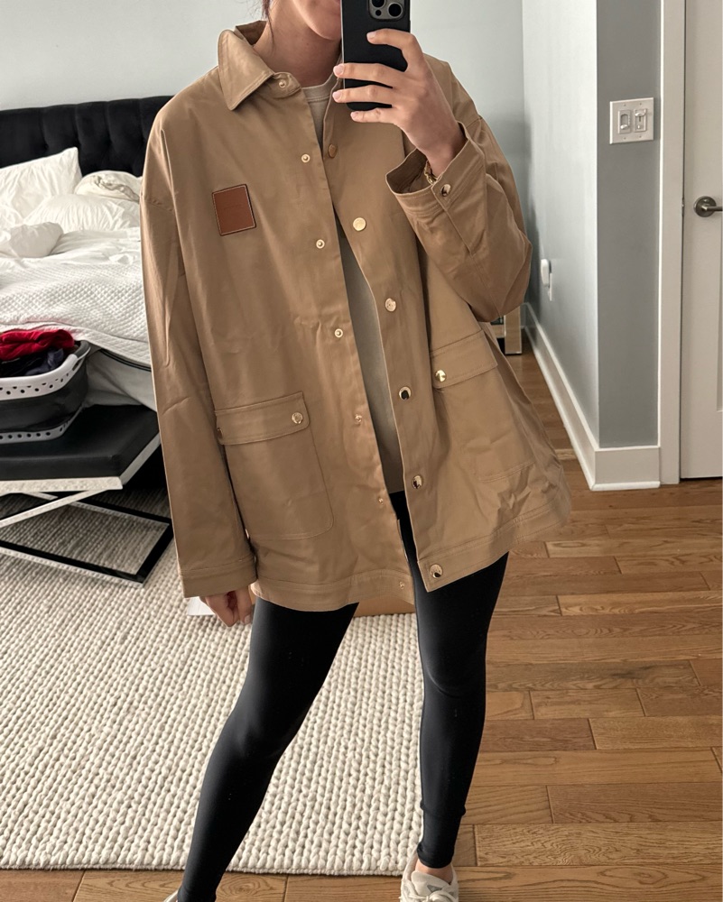 This versatile beige barn jacket is perfect for dressing up or down, making it suitable for a variety of occasions.