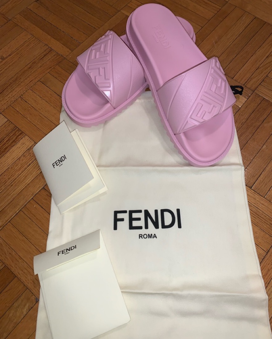 Designed with serrated soles for grip, they have a rubber strap that’s embossed with the label's FF motif.