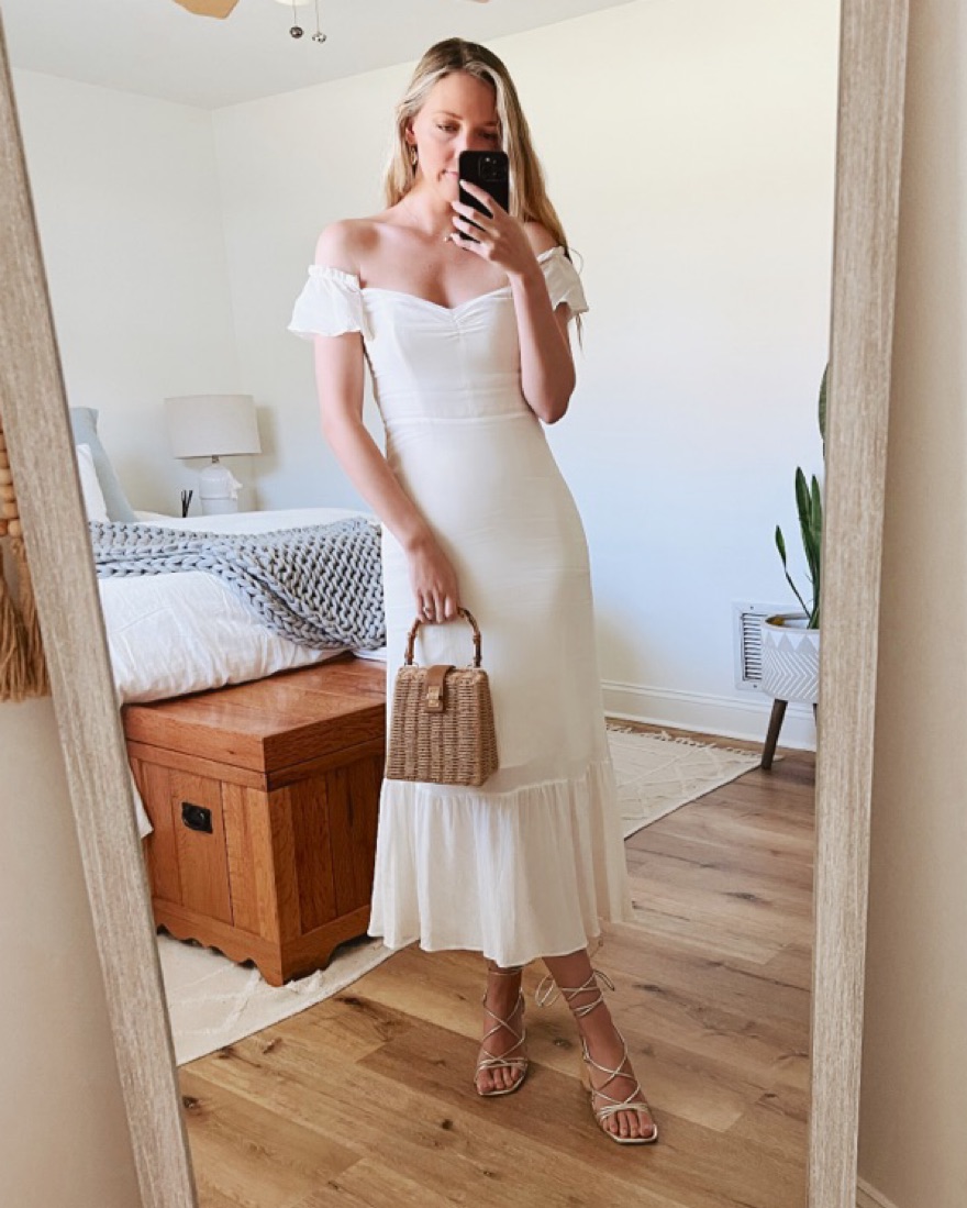Wore this to my bridal shower! Its perfect for a bride to be. Midi length white dress with a sweetheart neckline, ruffle hem, off shoulder sleeves, and a slightly sheer fabric. So pretty 🤍