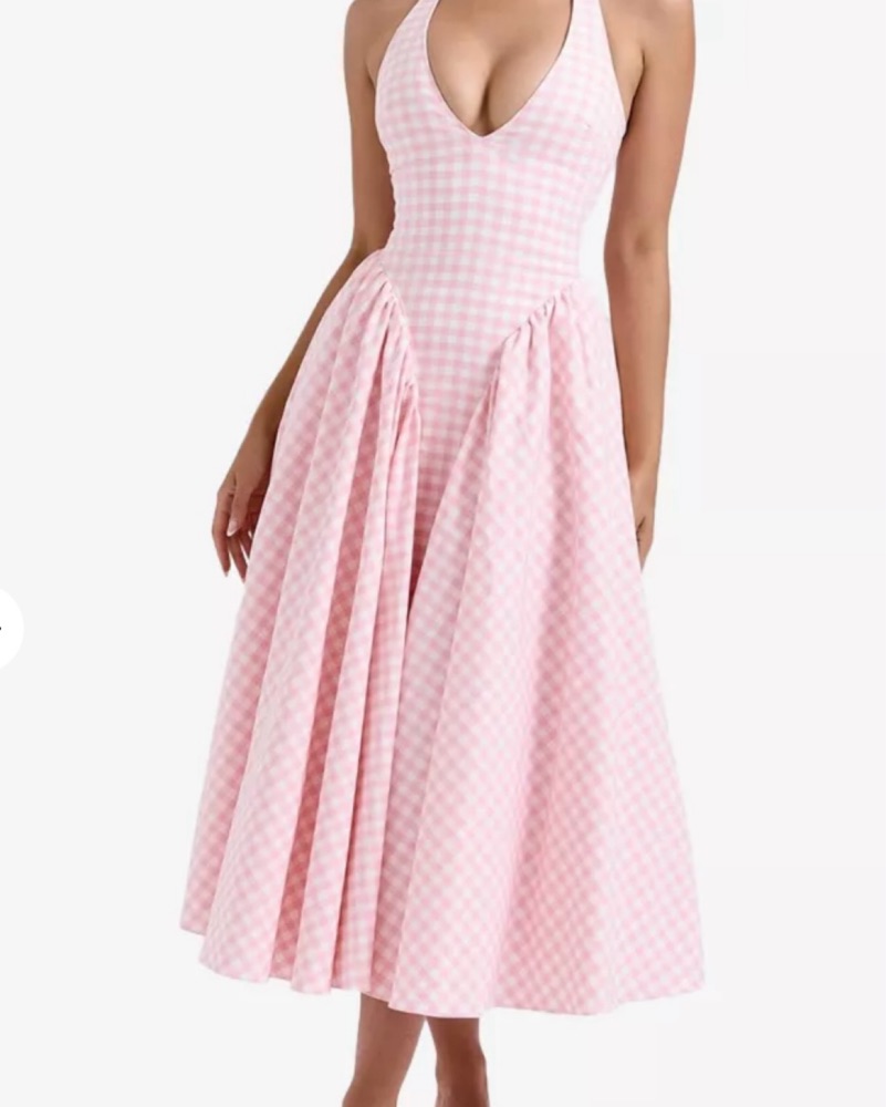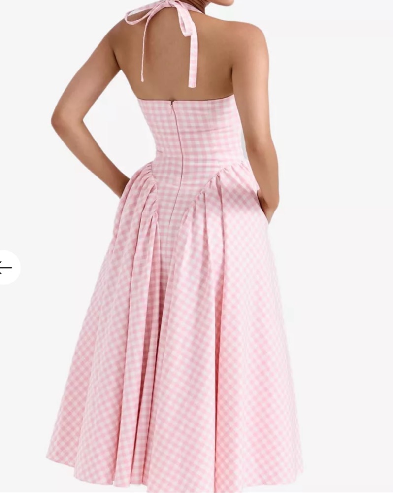 HOUSE OF CB Marilyn gingham stretch-woven midi dress in pink gingham / strawberry shortcake. Size L 10-12.